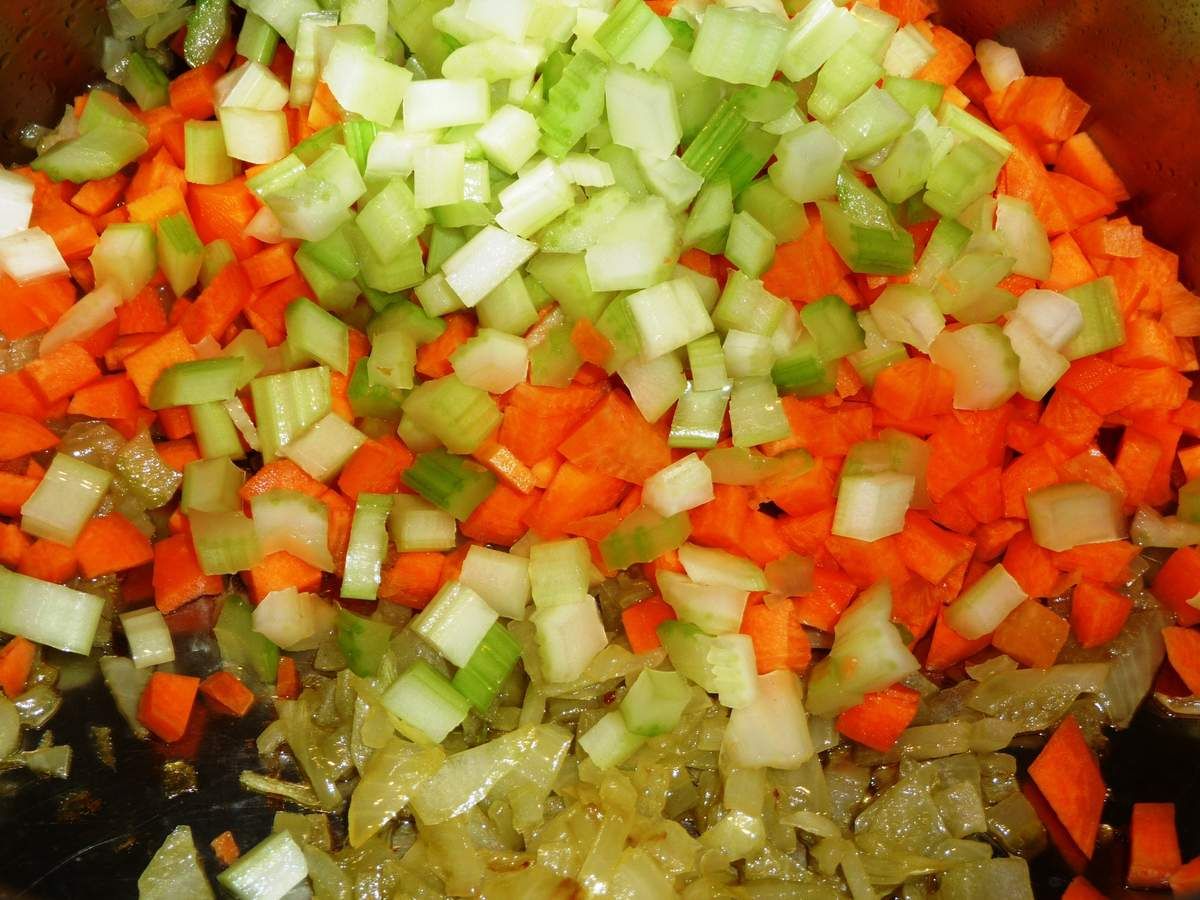 1) Hacher l’oignon et mettre dans un bol. Peler la carotte et la couper en brunoise (petits dés), faire de même avec le céleri.