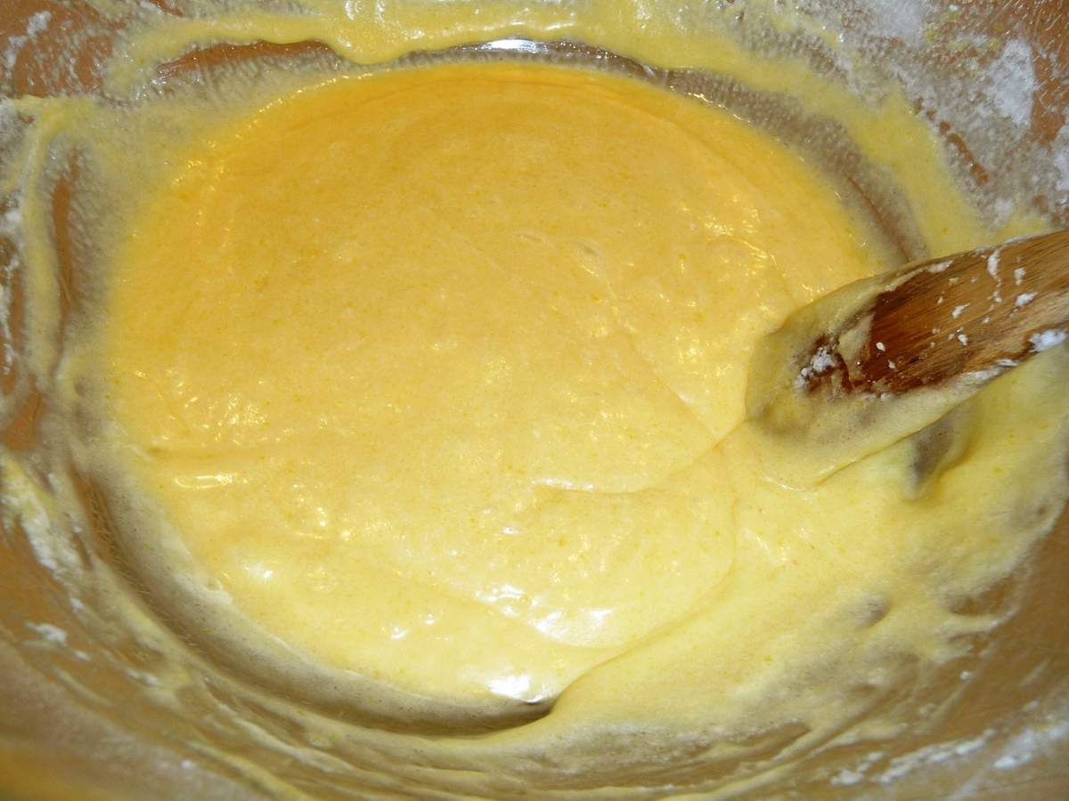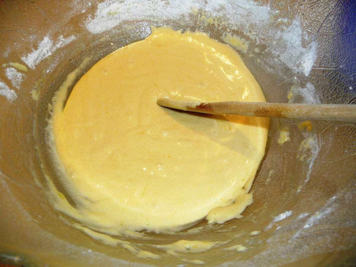 2) Faire fondre le beurre dans une petite casserole à feu doux. Laisser tiédir. Ajouter dans le mélange jaunes d'oeufs-sucre. Mélanger avec une spatule. Ajouter les 4 càs de lait et mélanger. Mélanger la farine avec la poudre à lever et ajouter. Bien mélanger avec une spatule jusqu'à ce que la pâte soit uniforme.