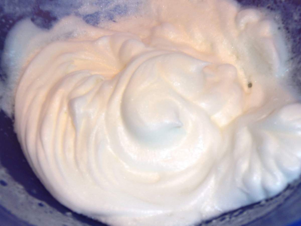 3) Monter les blancs en neige ferme au batteur électrique en ajoutant une pincée de sel. S'ils sont fermes, c'est que vous pouvez retourner le plat sans qu'ils ne bougent. Essayez c'est très drôle (surtout s'ils ne sont pas fermes). Hihihi.