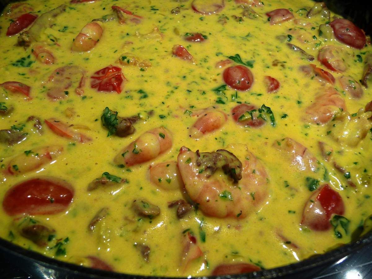 J'ai fait avec mes fonds de tiroirs. J'avais juste acheté les crevettes et le reste, de l'impro. Et ça marche souvent très bien. Cette sauce est parfaite et tout le monde à la maison l'a adorée. Des crevettes, des chanterelles, du curry, des tomates cerises, miam...