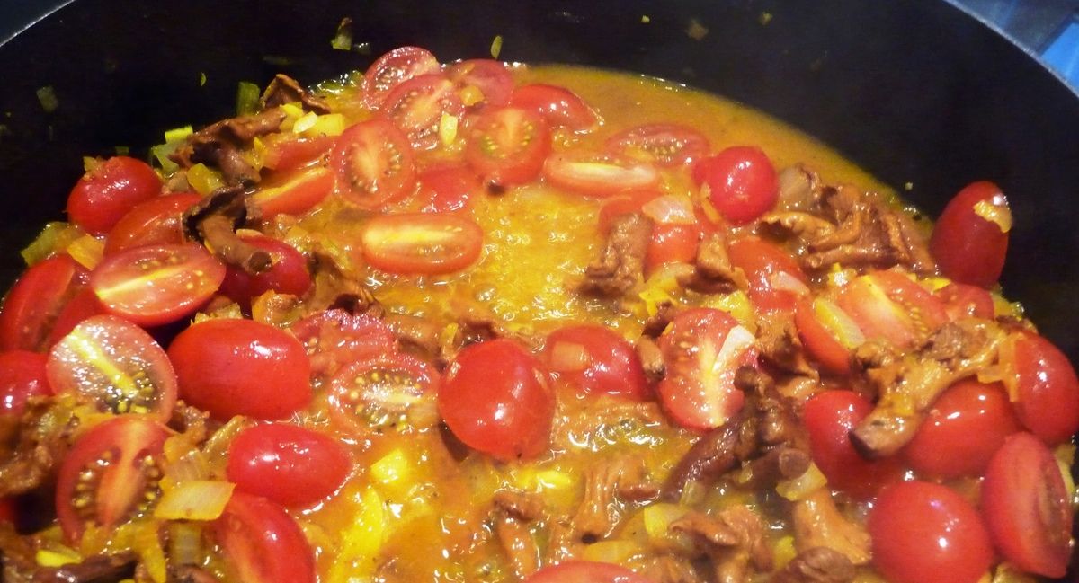 5) Ajouter le vin blanc et le cube de bouillon. Laisser réduire de moitié durant 5 minutes. Ajouter le curry ou le safran ainsi que les tomates, laisser cuire encore 2 minutes.