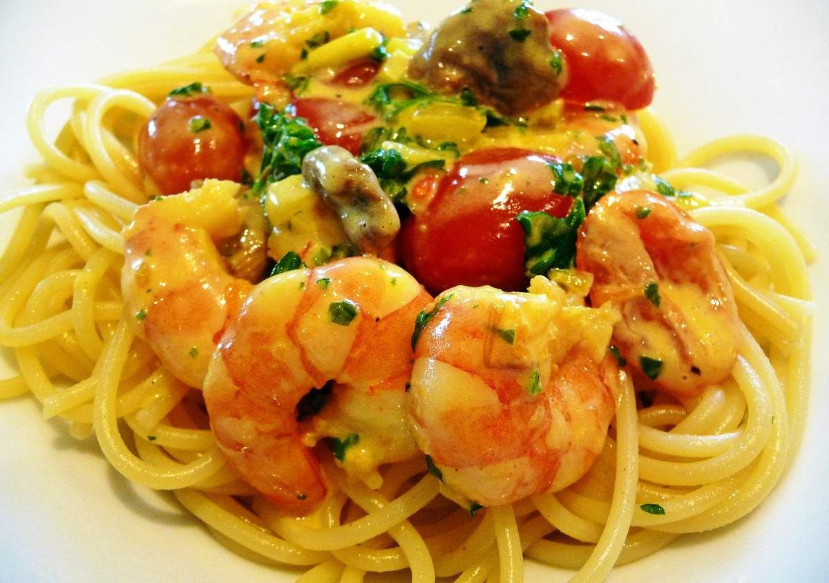 Pâtes aux crevettes, chanterelles et tomates cerises