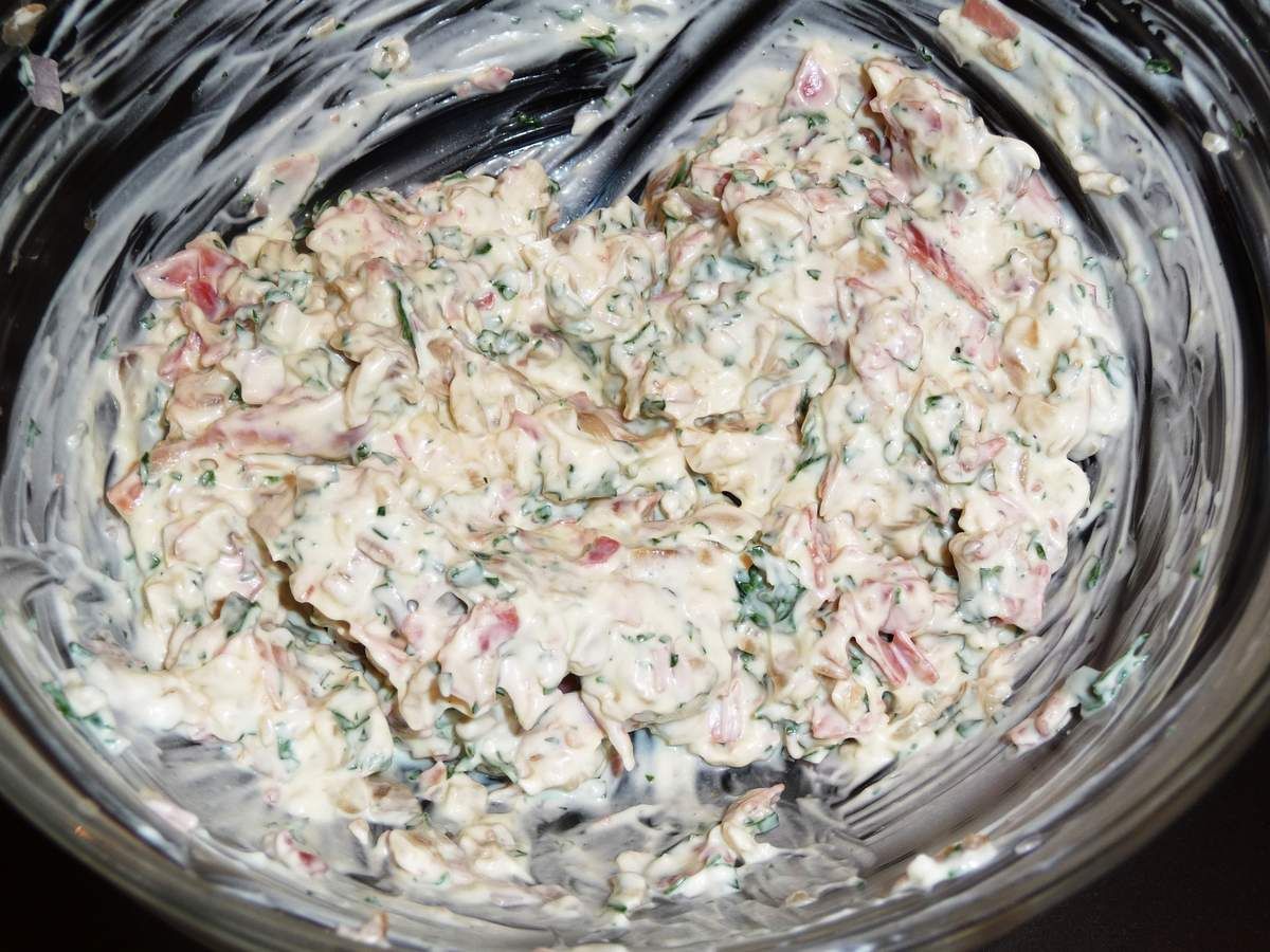 5) Hacher le persil et ajouter. Ajouter la moutarde, le jus de citron, le Philadelphia, une pincée de sel. Goûter et rectifier l'assaisonnement.