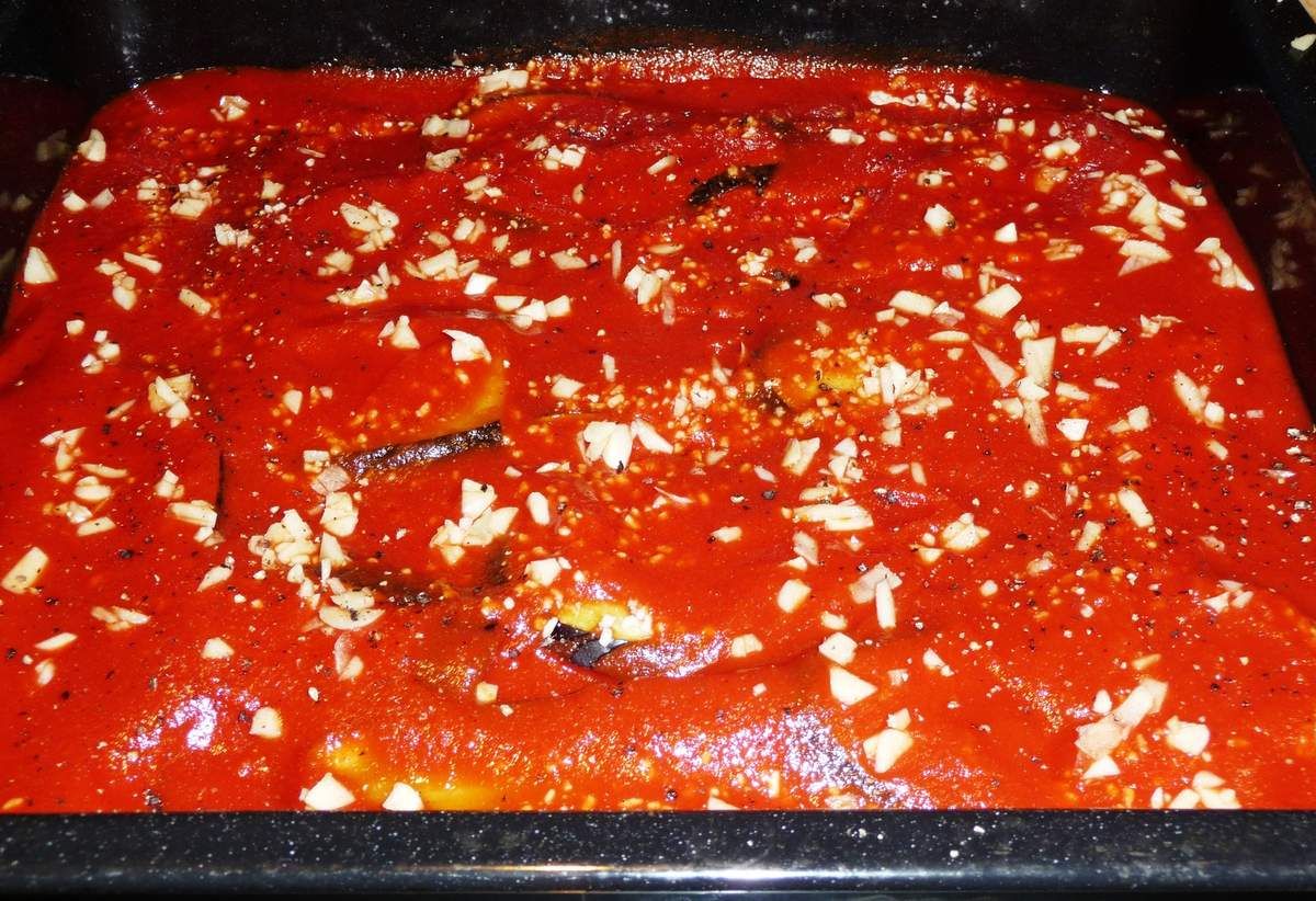 3) Emincer l'ail. Verser la purée de tomates sur les aubergines. Parsemer d'ail. Poivrer et ajouter une pincée de sel (pas plus, le parmesan sale déjà l'ensemble).