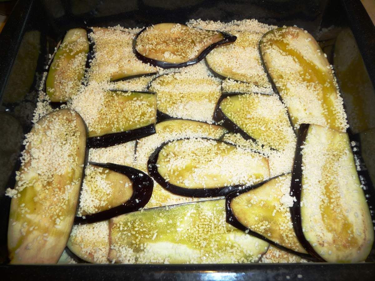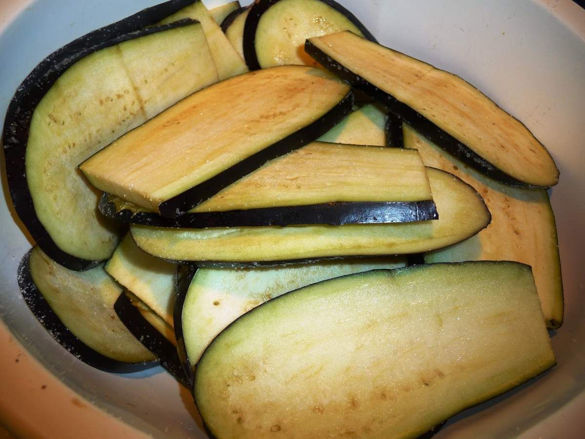 1) Laver les aubergines et couper dans la longueur des tranches d'environ 1/2 cm d'épaisseur. Les mettre dans une passoire et les saler largement. Mélanger et faire dégorger ainsi durant 1 heure.