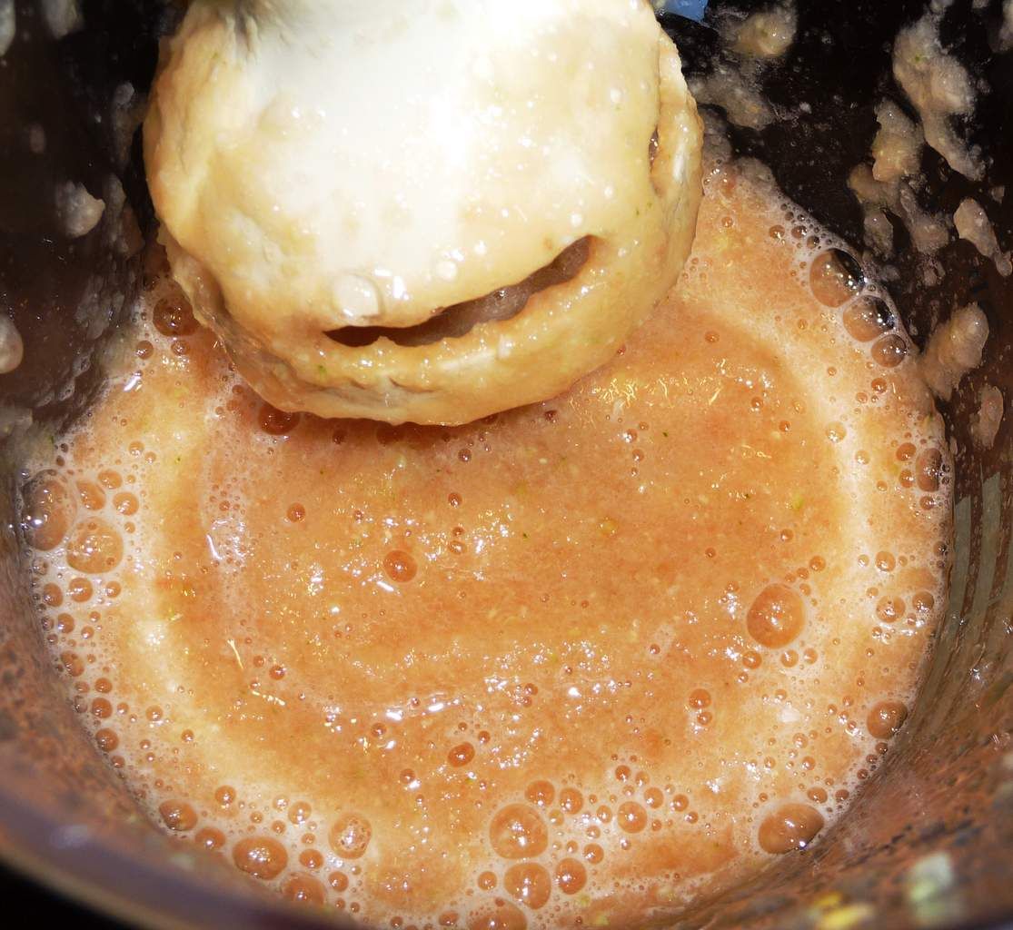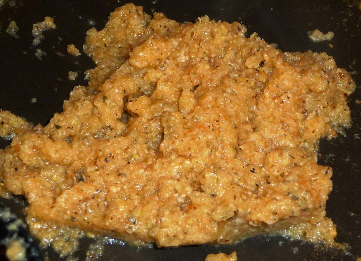 2) Peler et hacher grossièrement oignon et ail. Mettre dans le récipient contenant la chair des légumes. Mixer le tout avec un plongeur. Egoutter le mélanger à travers une passoire pour éliminer le maximum de jus. Dans une poêle, mettre un filet d’huile d’olive et faire revenir ce mélange quelques minutes en salant et poivrant et en ajoutant un petit peu d’herbes de Provence. Lorsque les légumes ont rendu toute leur eau, arrêter le feu et laisser refroidir (au moins tiédir). Le mélange doit avoir la consistance d’une pâte.