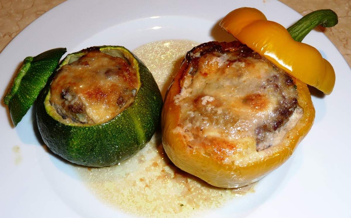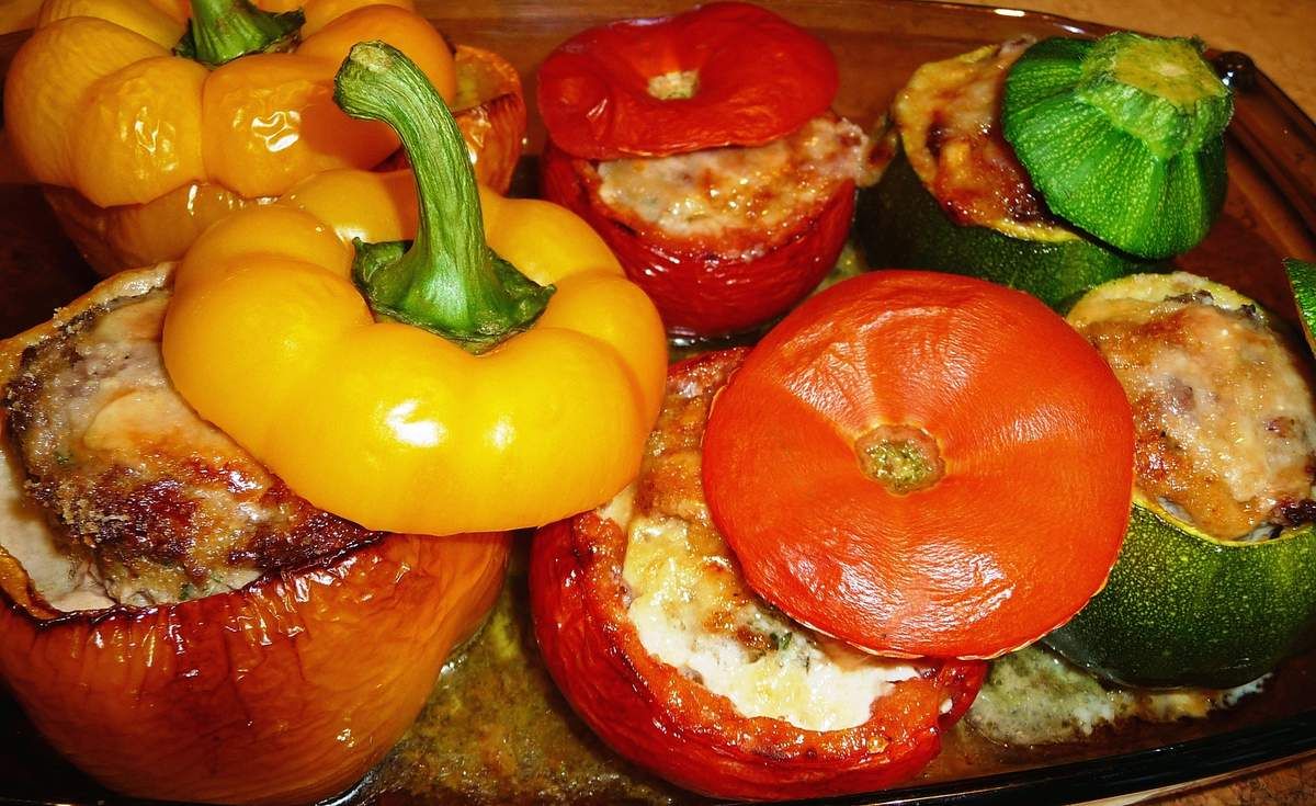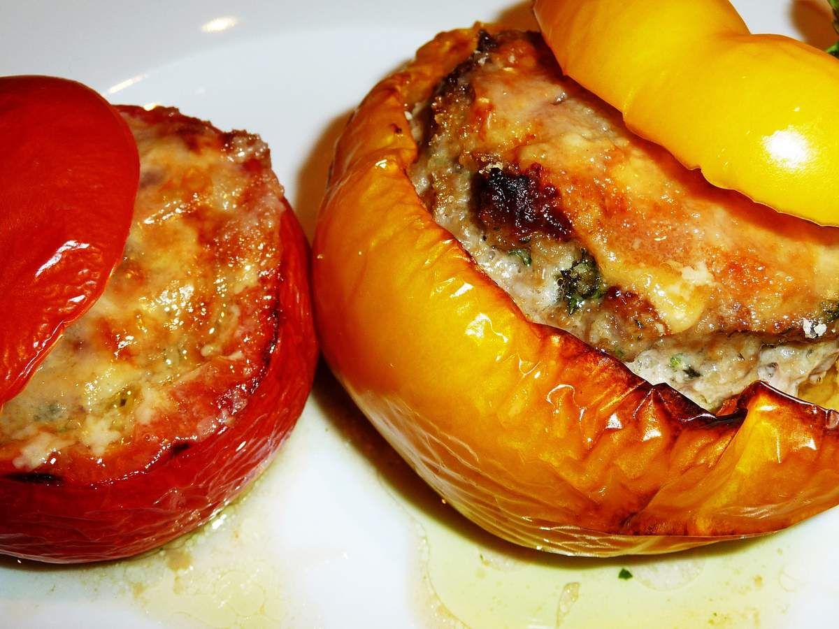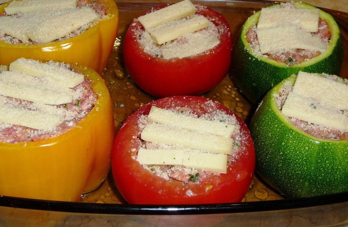 5) Préchauffer le four à 180°C. Dans un plat à gratin, mettre un filet d’huile d’olive, ajouter un filet d’eau (juste un petit fond) et émietter le demi-bouillon. Disposer les légumes dans le plat. Les farcir du mélange généreusement. Disposer une lamelle de gruyère sur chaque légume et saupoudrer d’un peu de chapelure. Enfourner. Après 45 minutes, ajouter les chapeaux et cuire encore 15 minutes. Servir avec du riz ou des pommes-de-terre sautées par exemple… Ou avec un bon morceau de pain, cela suffit !