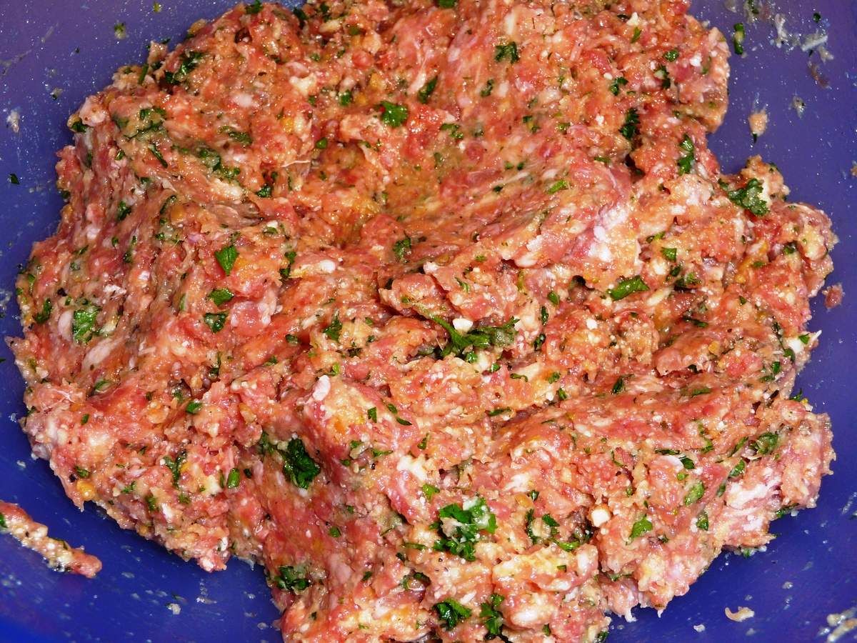 4) Dans un grand récipient, mettre la viande hachée, la saucisse à rôtir dont vous aurez enlevé la peau,  le persil haché, l’œuf ou les oeufs entiers, la mie de pain essorée entre vos doigts, 1 càs de chapelure, le parmesan et le mélange de chair de légumes. Bien mélanger, poivrer et saler.