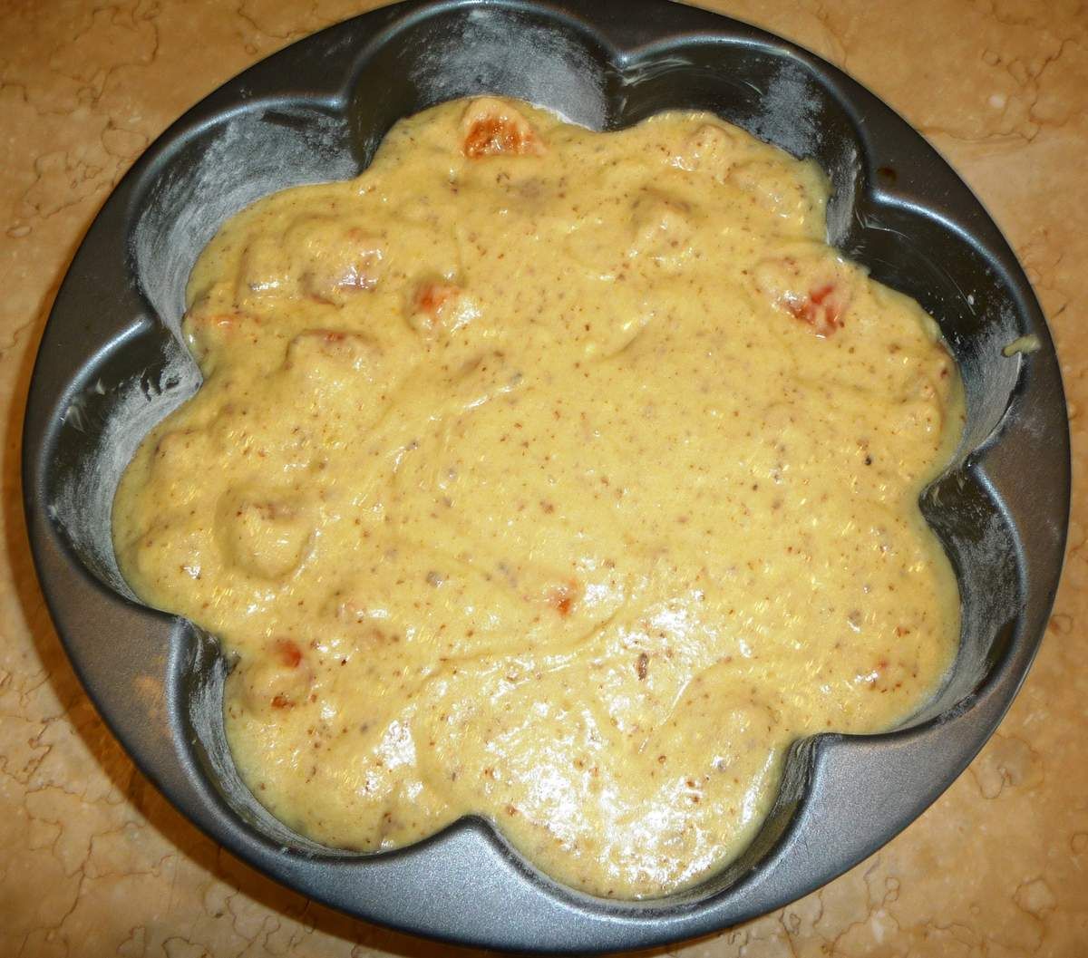 3) Ajouter les abricots et le mélange de farine dans le plat des oeufs-beurre-sucre. Mélanger à la spatule. Ajouter le yaourt et encore une fois mélanger. Verser dans le moule à manqué.