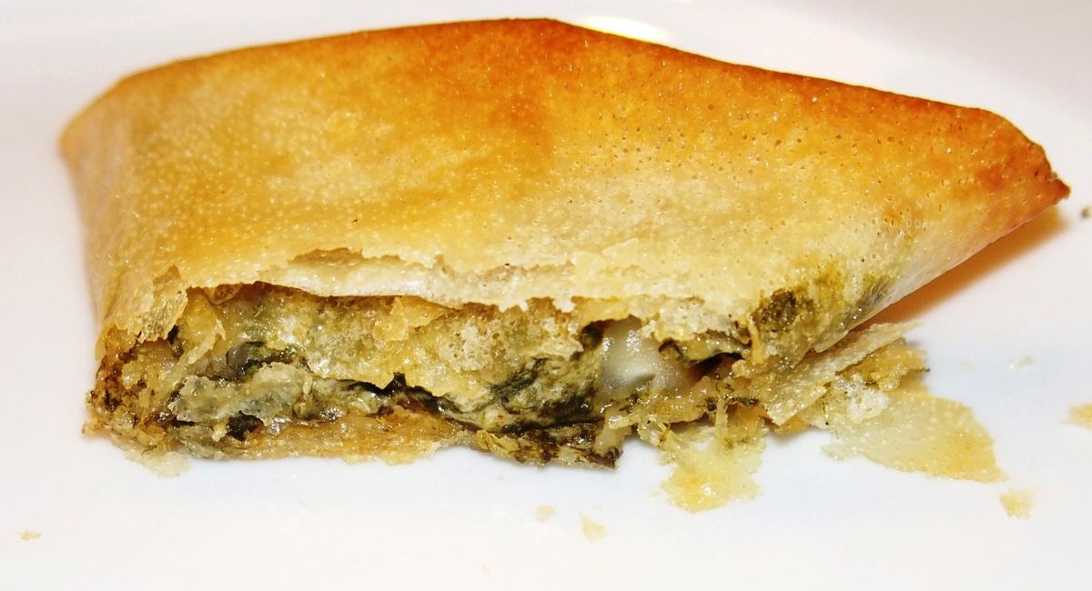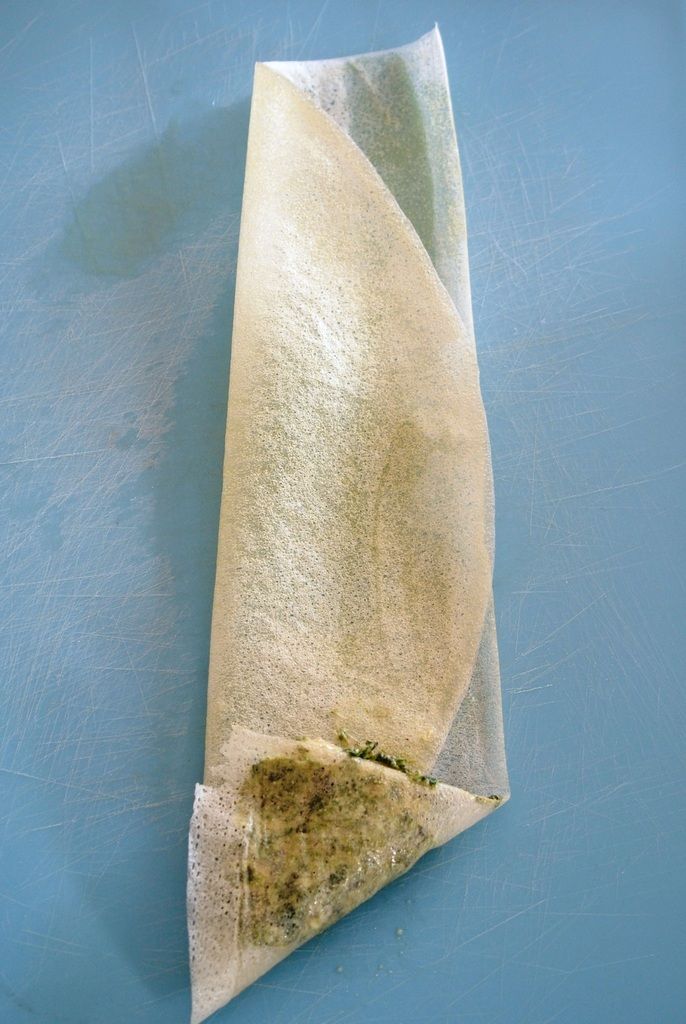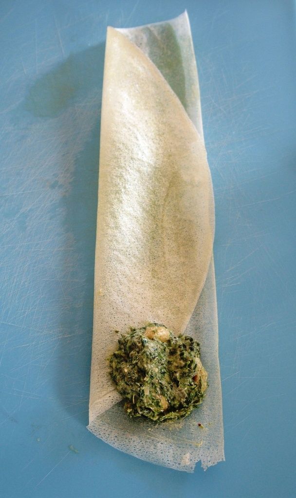 Une farce à tomber par terre faite de fromage de chèvre frais, d'épinards, de pignons de pin, de menthe, de cumin... emprisonnée dans des feuilles de brick (que l'on trouve en grande surface).