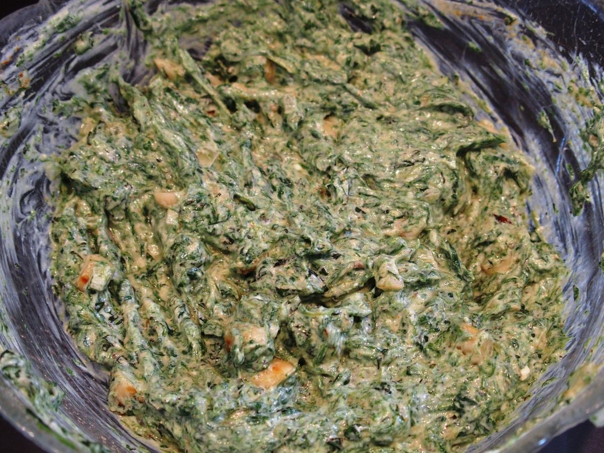 1) Décongeler les épinards. Hacher l'oignon. Dans une poêle, mettre un peu d'huile d'olive à chauffer et faire revenir l'oignon 1 minute puis ajouter les épinards. Chauffer à feu moyen en mélangeant bien jusqu'à ce que les épinards aient bien rendu toute leur eau. Réserver et laisser refroidir dans un bol.