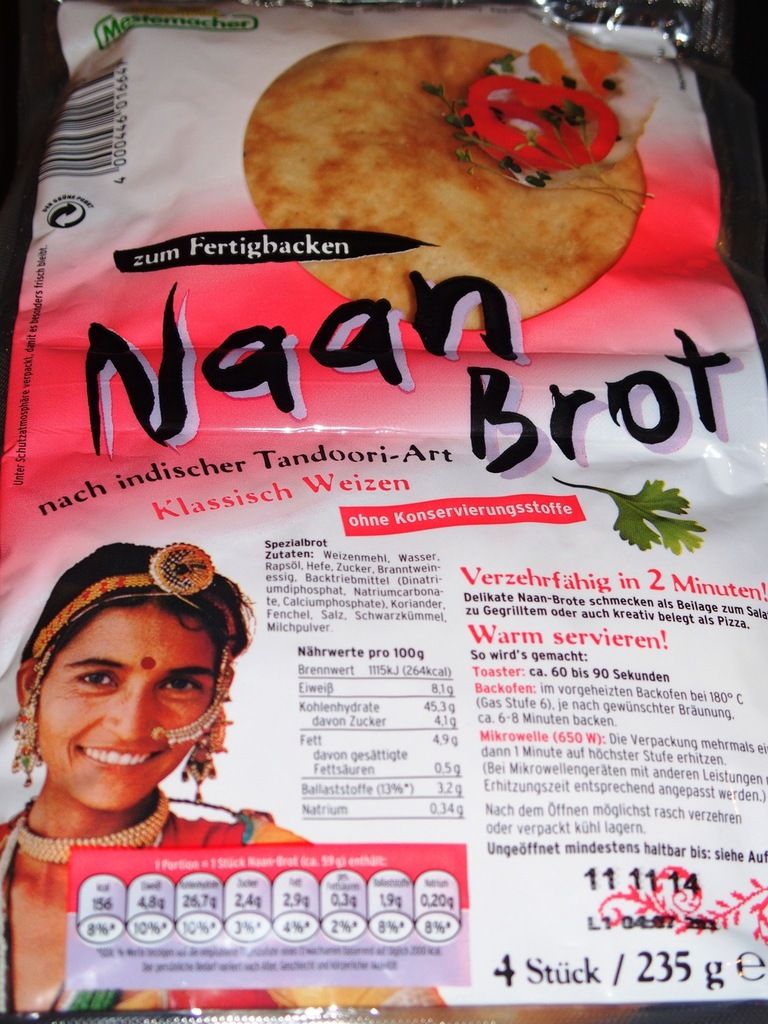4) Pendant ce temps, réchauffer les pains Naan au four comme indiqué sur le paquet d'emballage. Préparer la sauce raïta: Mélanger le yaourt et la crème acidulée et ajouter la menthe ciselée. Saler et poivrer. Couper les oignons rouges en lamelles. Peler le concombre et le couper en lamelles. Voici les pains Naan: