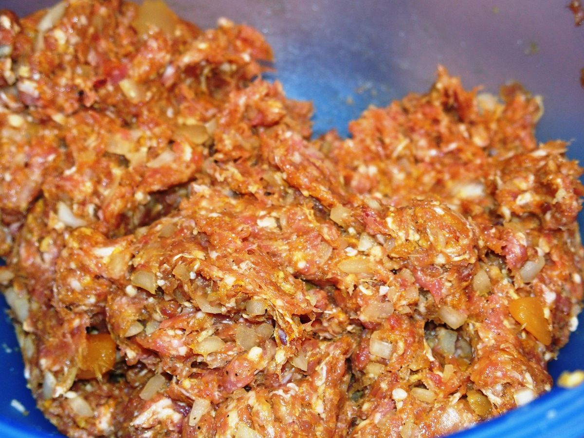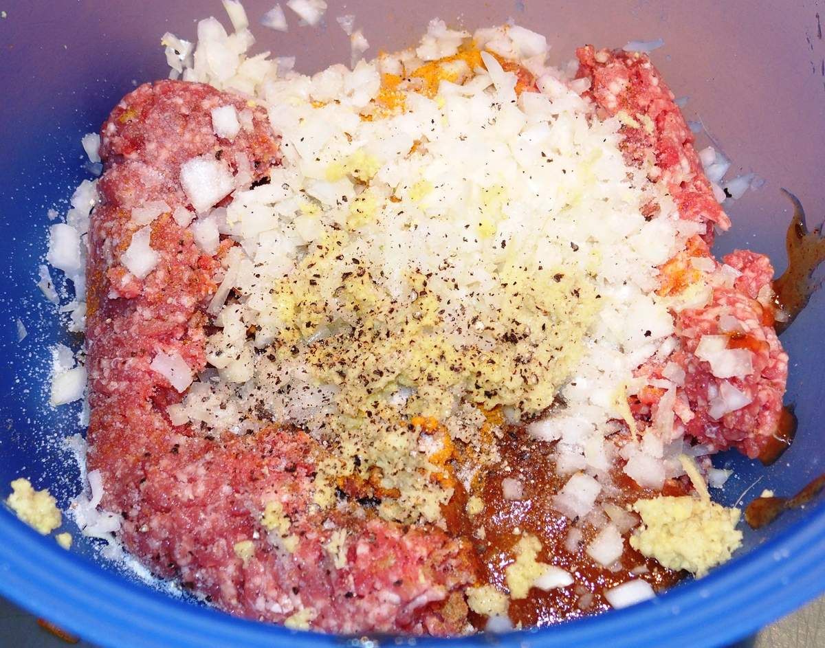 1) Dans un grand récipient, mettre la viande hachée et ajouter les épices: le curcuma, le garam masala, le piment de Cayenne, le cumin, la coriandre. Hacher l'oignon et presser l'ail avec le presse-ail et ajouter ainsi que 2 càs de chutney de mangue. Peler le gingembre et le râper à la râpe fine pour obtenir environ 2 càs. Mettre dans le récipient. Saler (2 càc) et poivrer. Bien mélanger le tout avec vos petits doigts.