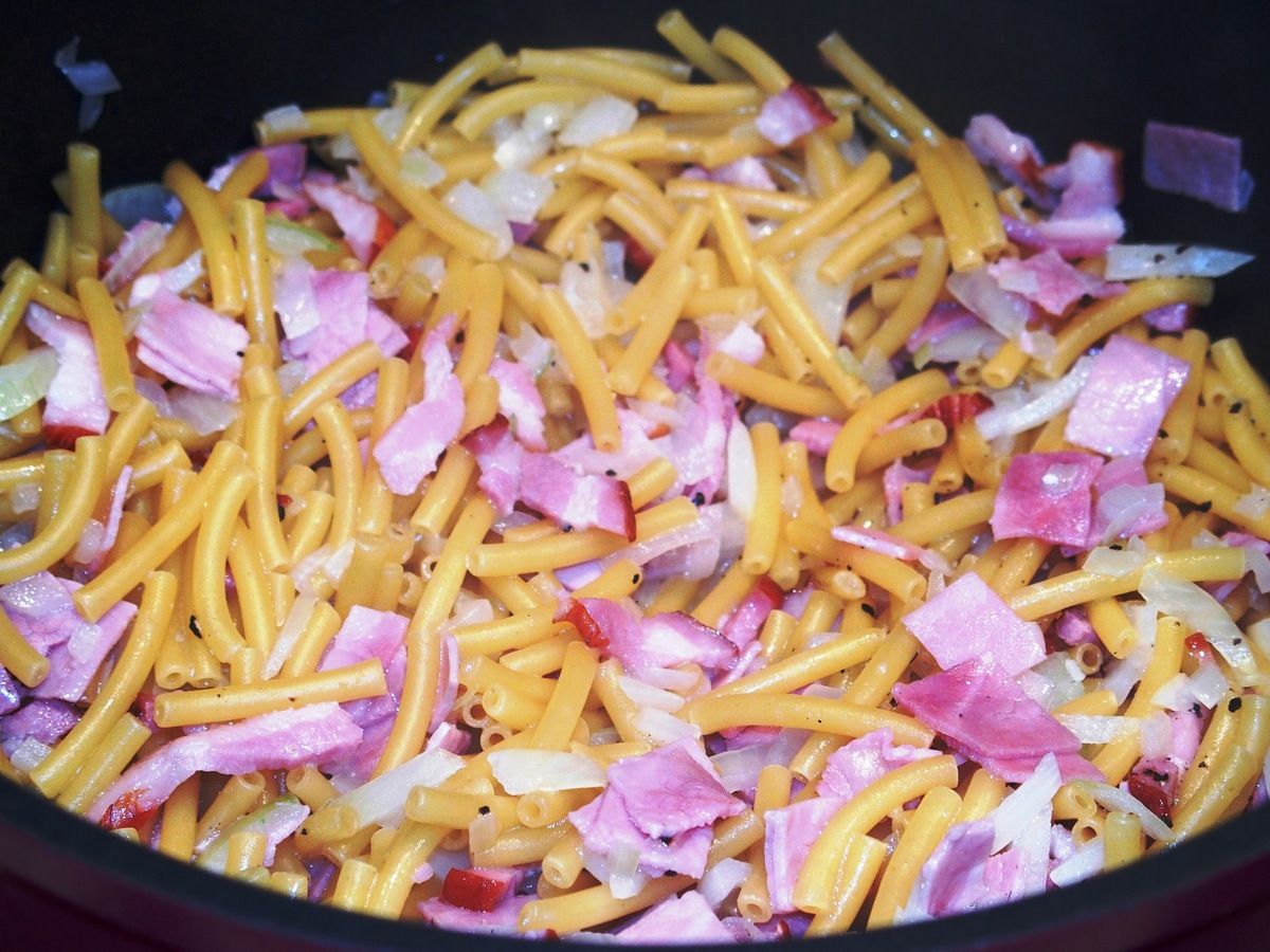 Pas de problème, il y a toujours une solution... J'ai utilisé un faitout et c'était extra. On ne pense pas à cuire les pâtes autrement que dans de l'eau bouillante, et pourtant. C'est fameux, et les pâtes ont le temps de s'imprégner de tous les goûts dans la casserole.