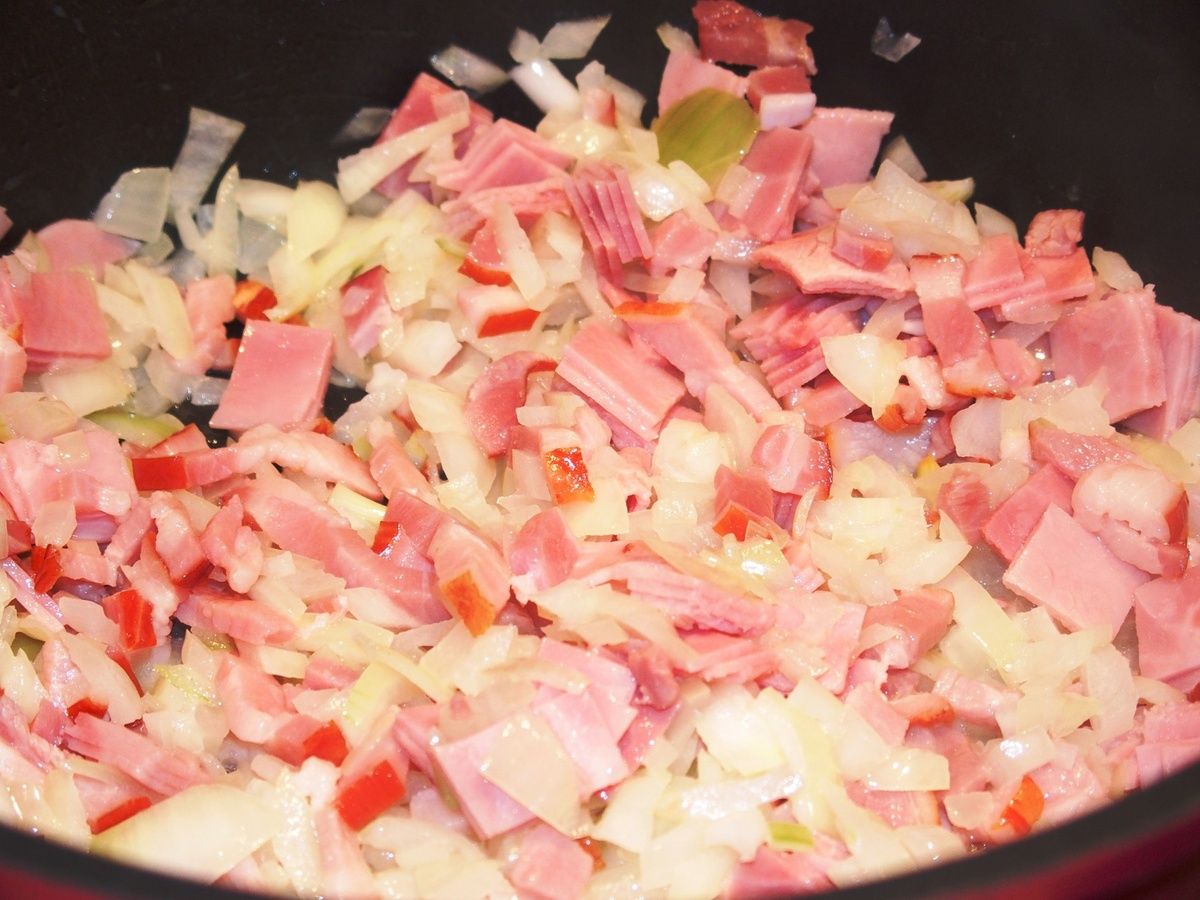 3) Dans un faitout ou une casserole en fonte, faire fondre le beurre et faire revenir oignon et ail une minute. Ajouter les lardons et le jambon. Faire revenir sur feu moyen 2 minutes en mélangeant.