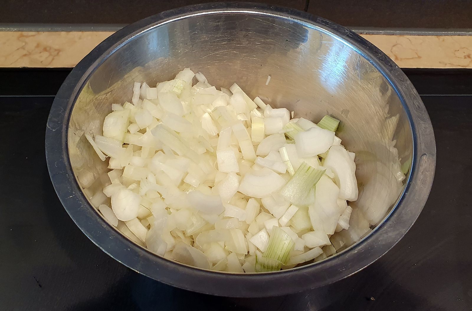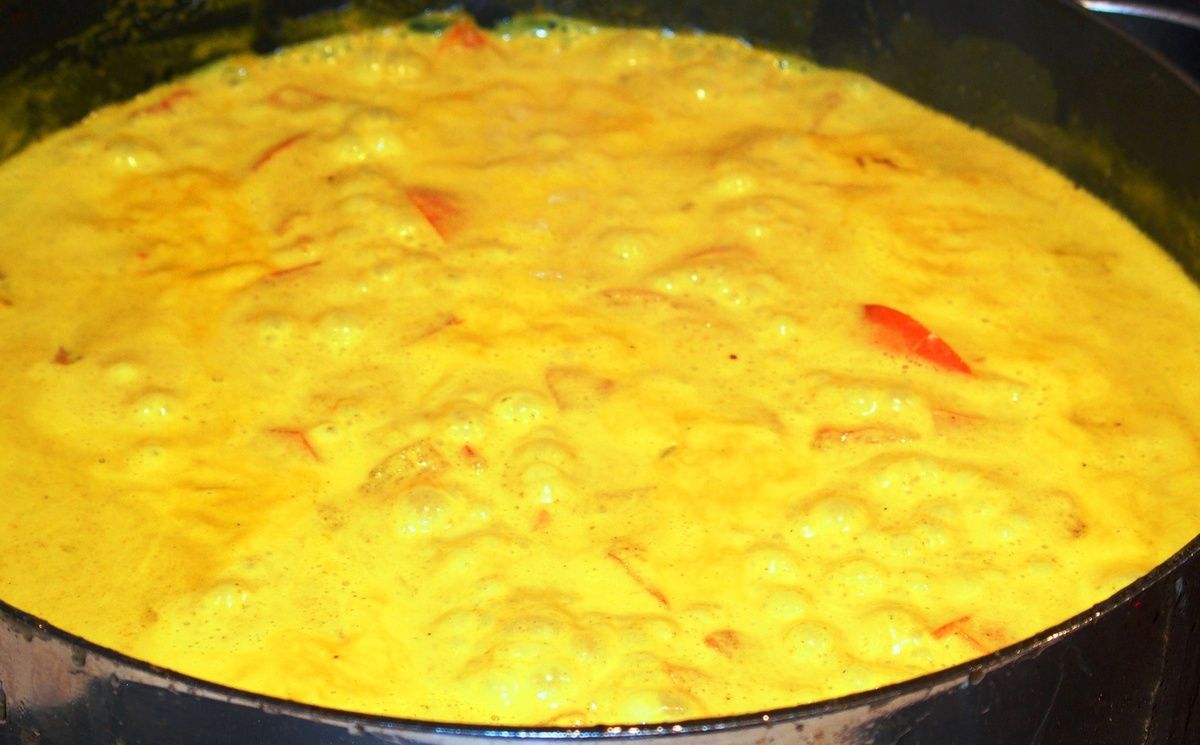 2) Hacher l'oignon jaune et l'ail. Dans la même poêle, remettre un peu d'huile et les faire revenir 1 minute à feu moyen. Ajouter les épices: le cumin, la cannelle, le gingembre, le curcuma, le piment. Mélanger avec une spatule. Verser le lait de coco. Saler et poivrer. Porter à ébullition puis baisser sur feu doux et laisser mijoter environ 10 minutes.