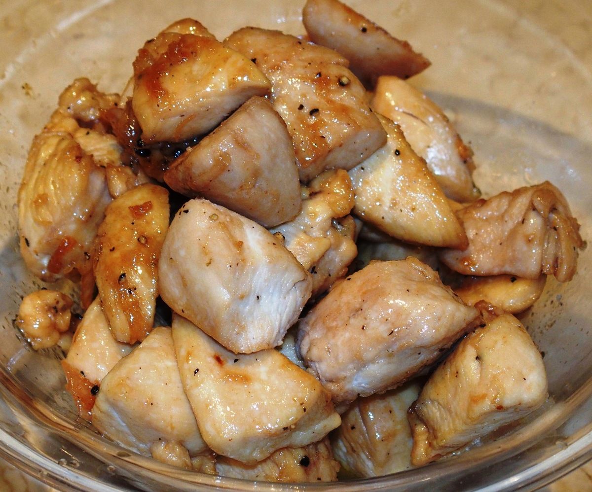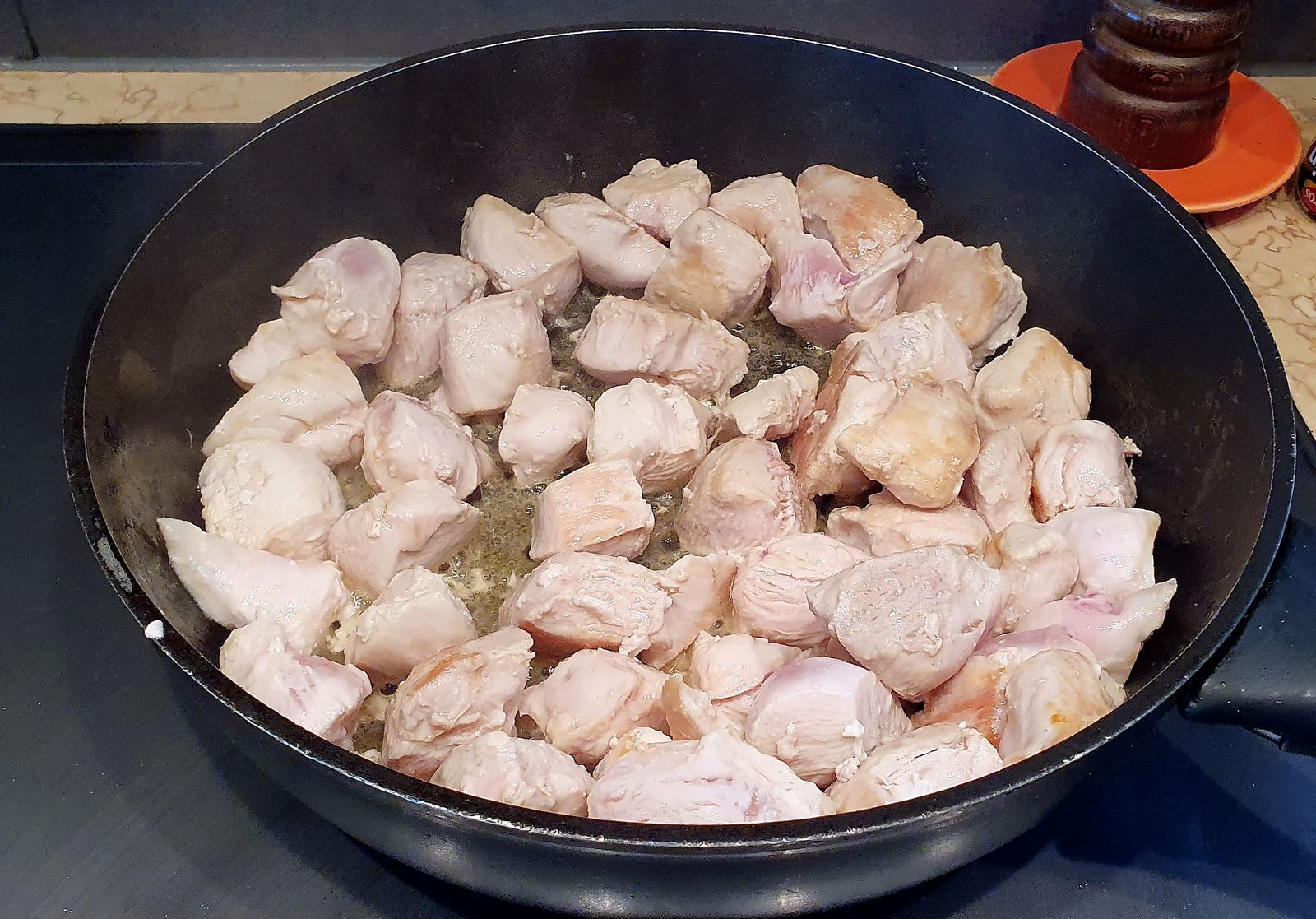 1) Couper le poulet en gros dés. Dans une poêle, faire chauffer un filet d'huile et le faire revenir 5 minutes jusqu'à ce qu'il soit doré. Saler et poivrer. Saupoudrer de sucre et faire cuire encore 5 minutes en mélangeant régulièrement pour le caraméliser. Réserver dans un récipient.