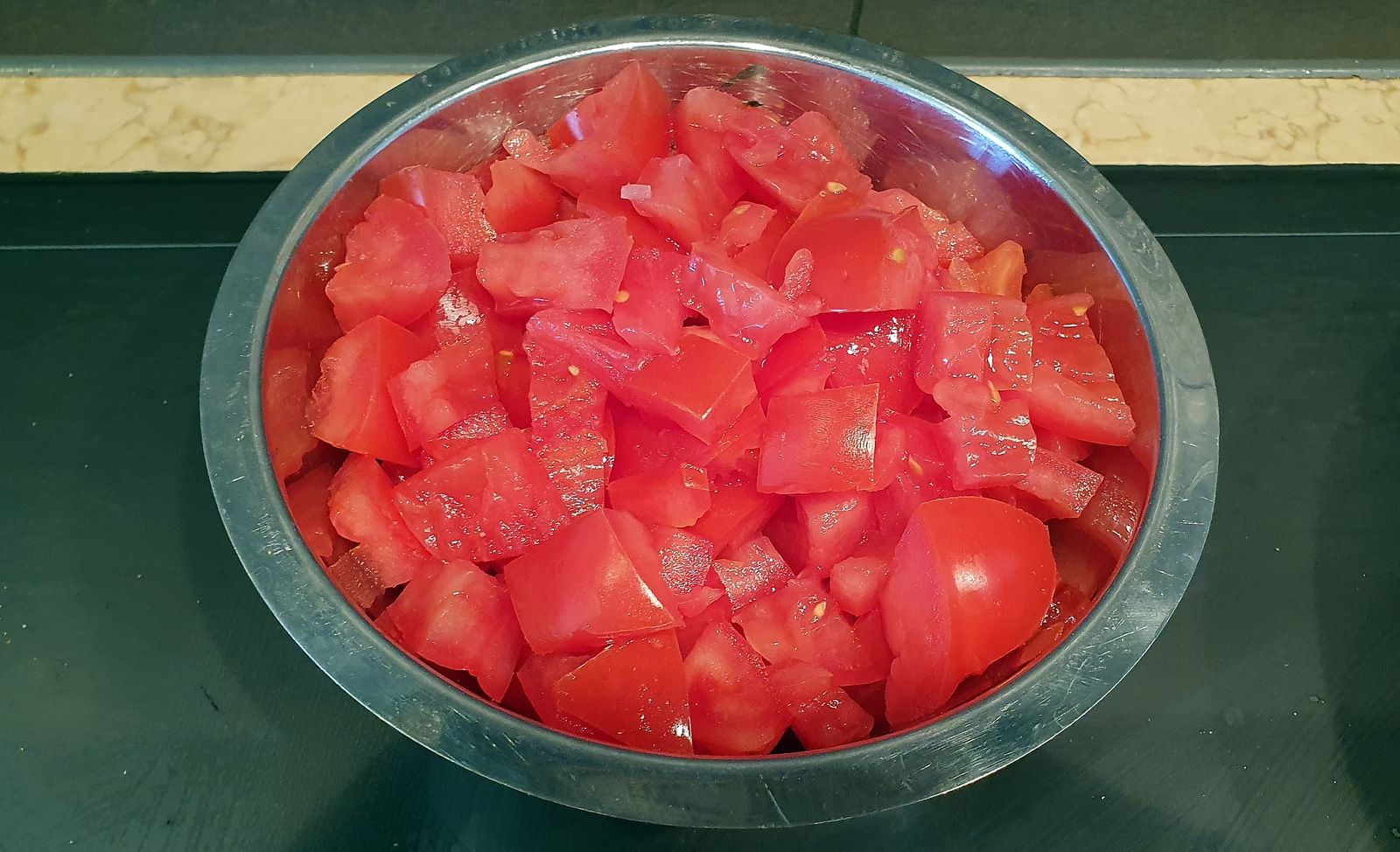 3) Pendant ce temps, couper les tomates et enlever les pépins et le jus. Couper en dés. Ajouter les tomates dans la poêle et laisser cuire encore 10 minutes sur feu doux.