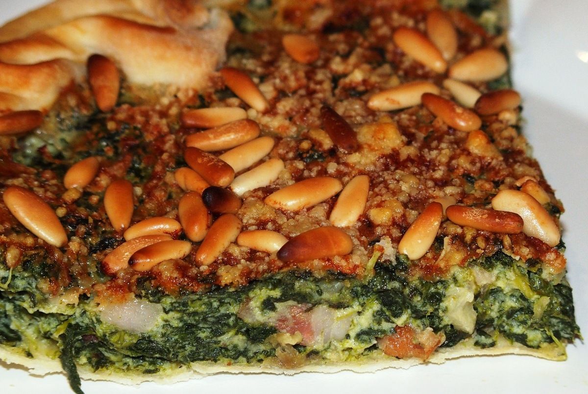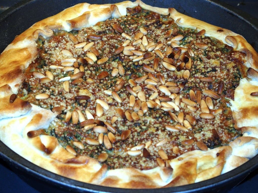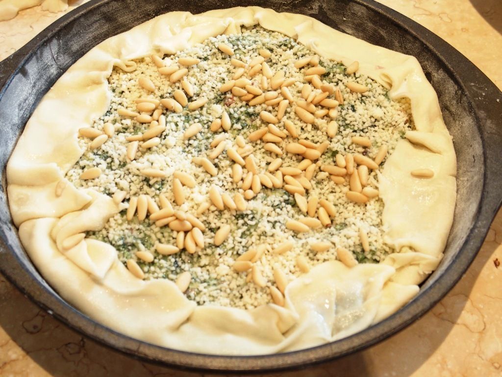 Une magnifique tarte aux épinards donc. Avec de la ricotta, des lardons, échalotes, ail, des pignons pour le fun...