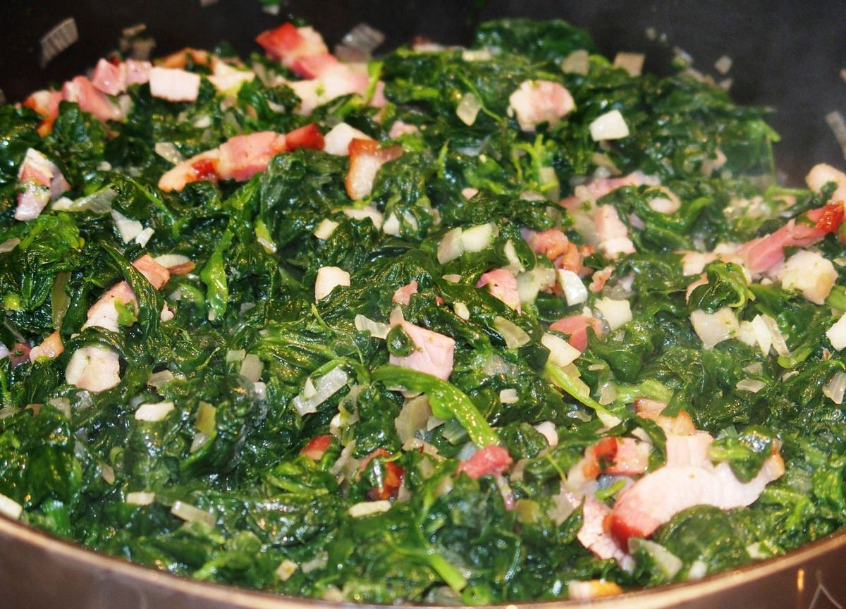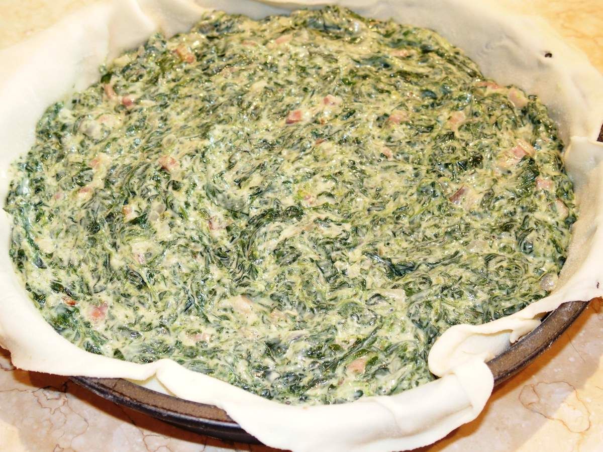 1) Quelques heures avant ou la veille, penser à décongeler les épinards. Hacher ail et échalotes. Dans une poêle, faire chauffer un filet d'huile à rôtir. Faire revenir les lardons avec l'ail et les échalotes à feu moyen durant 3 minutes en mélangeant régulièrement. Ajouter les épinards en branches et cuire toujours à feu moyen durant une bonne dizaine de minutes en tournant souvent le mélange, et ce jusqu'à ce que les épinards aient rendu toute leur eau. Quand ils commencent à "attacher" le fond, c'est bon! Saler et poivrer. Mettre le tout dans une passoire et laisser tiédir.