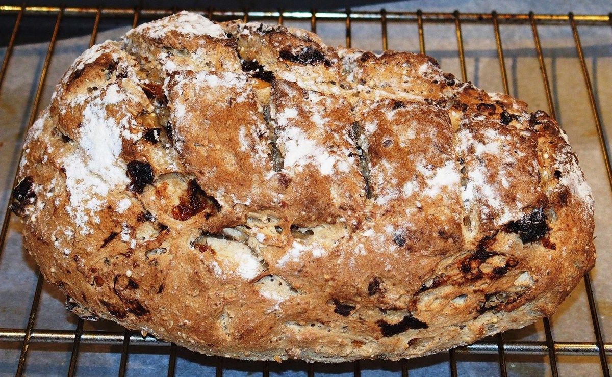 6) Préchauffer le four à 200°C. Remplir un petit récipient (résistant à la chaleur du four) avec de l'eau et le mettre à côté du pain, ce qui permettra une belle croûte bien croustillante et un intérieur moelleux. Avec un couteau dentelé, faire des entailles dans le pain (assez profondes). Passer vos mains sous l'eau froide et mouiller légèrement le pain de toutes parts. Saupoudrer le pain avec un peu de farine. Enfourner. Après 25-30 minutes, vérifier la cuisson: tapoter le dessous du pain qui doit sonner creux. Si oui, c'est prêt! Sortir et laisser refroidir.