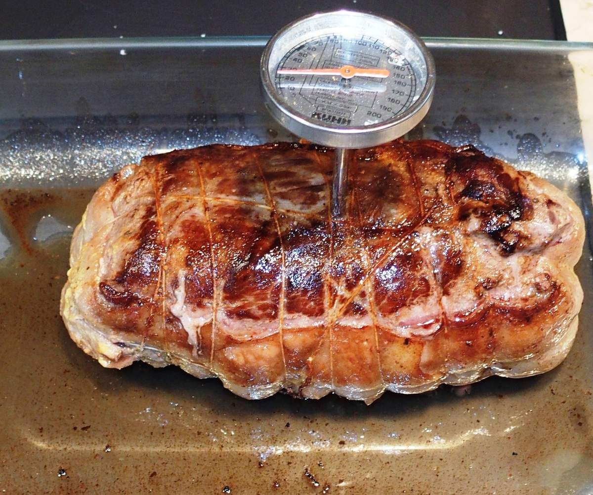Roti de 950 gr doré dans la poêe et mis au four à 80°.<br /> Au bout de deux heures, la sonde affichait 44°. Un peu juste. Pourtant, le four est récent et les températures sont à priori respectées. <br /> Pour avoir fait des gigots en cuisson lente, je m'étonnais d'un temps de cuisson aussi court à basse température. L'expérience confirme. Très bonne recette, mais prévoir de la marge sur le temps de cuisson. Surtout que le rôti pourra rester en attente au four au moins une heure à basse température.