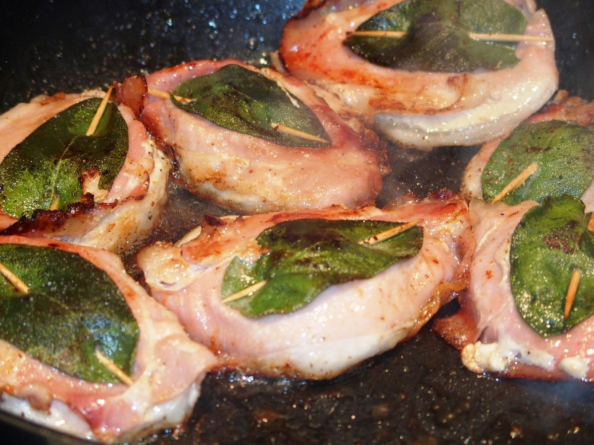 Dans la vraie recette romaine le porc n'a pas sa place, il y a dans la "paupiette" un morceau de mozzarella en plus du jambon, et la feuille de sauge est à l'intérieur. La sauce est plus élaborée (échalotes rissolées, crème).