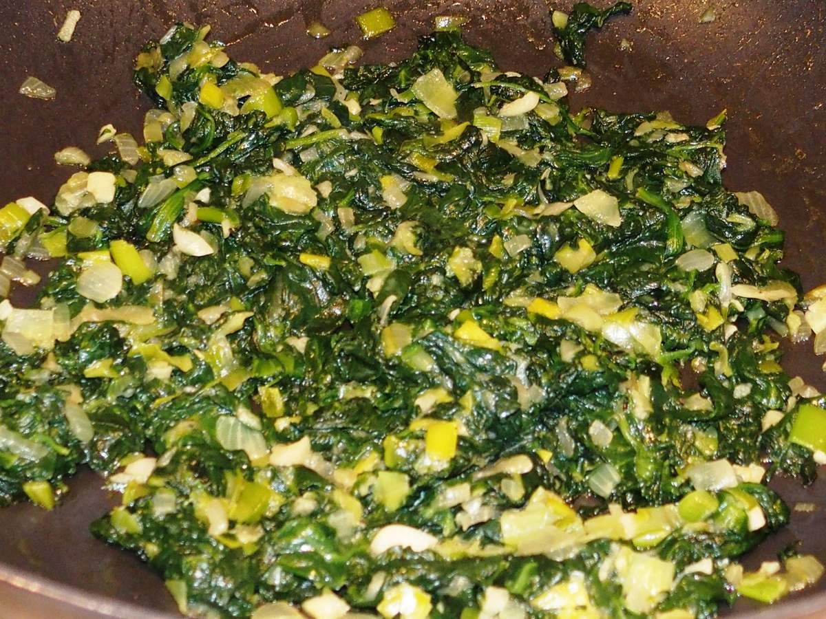 5) Hacher l'oignon et les gousses d'ail. Faire chauffer 20g de beurre dans une grande poêle et ajouter les oignons et ail. Faire revenir une minute sur feu moyen. Ajouter les épinards. S'ils sont frais, ne vous en faites pas, ils vont réduire de 3/4. Saler et poivrer et mélanger. Cuire ainsi 10 à 15 minutes jusqu'à ce qu'ils aient rendu toute leur eau. Mettre dans une passoire et appuyer avec une spatule fermement pour ôter l'éventuel jus restant. Réserver.