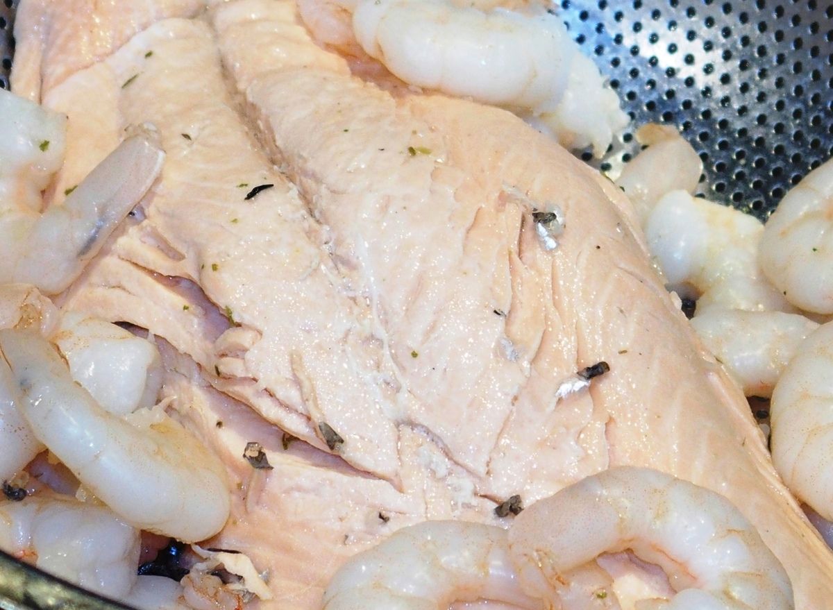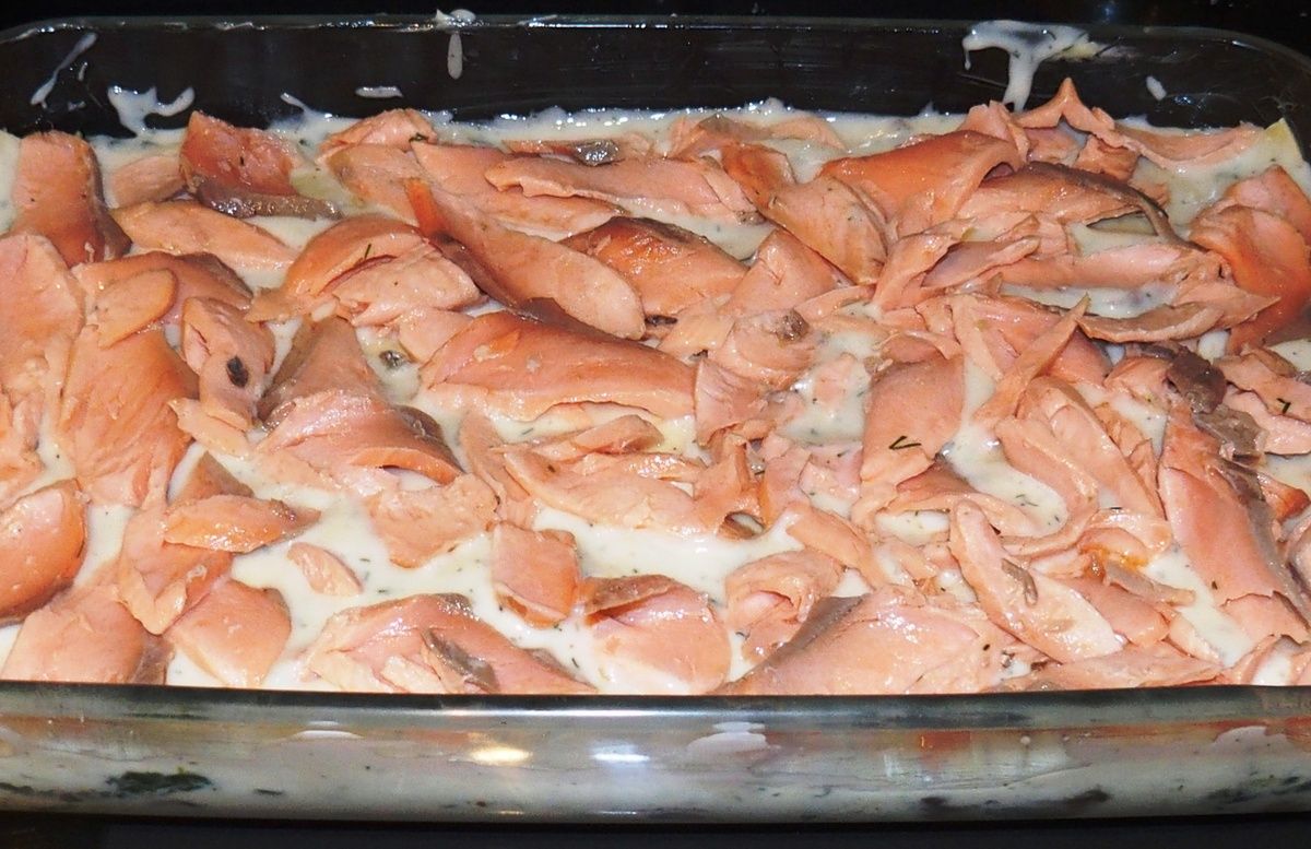 3) Prendre le saumon (ôter la peau) et le détacher en lanières (effilocher grossièrement). Couper les queues de crevettes en deux dans l'épaisseur (donc sur la longueur). Vous pouvez les laisser entières mais coupées en deux, elles seront plus adéquates pour faire une couche de lasagne régulière et pas trop "bombée). Réserver dans une assiette.