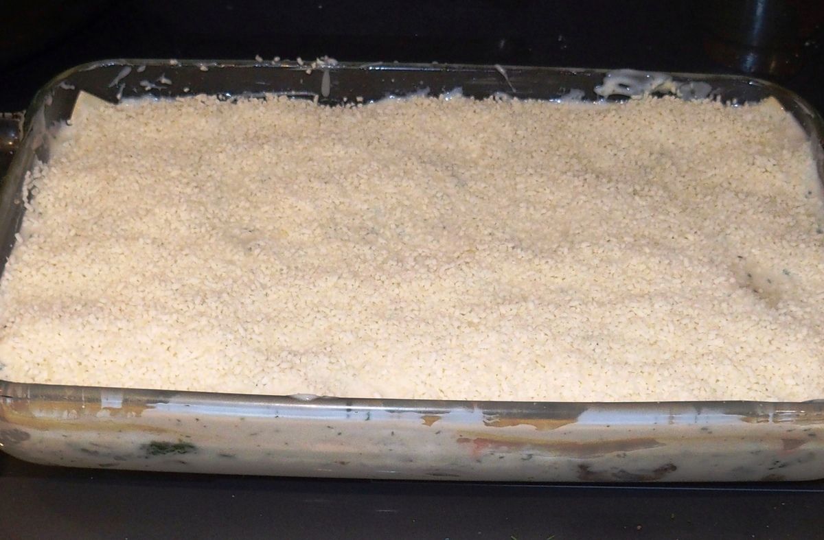 6) Préchauffer le four à 200°C. Utiliser les 10g de beurre restants pour beurrer un plat à gratin (pour ma part un plat de 33 sur 21 et 6cm de profondeur). Monter les couches de lasagne comme suit: