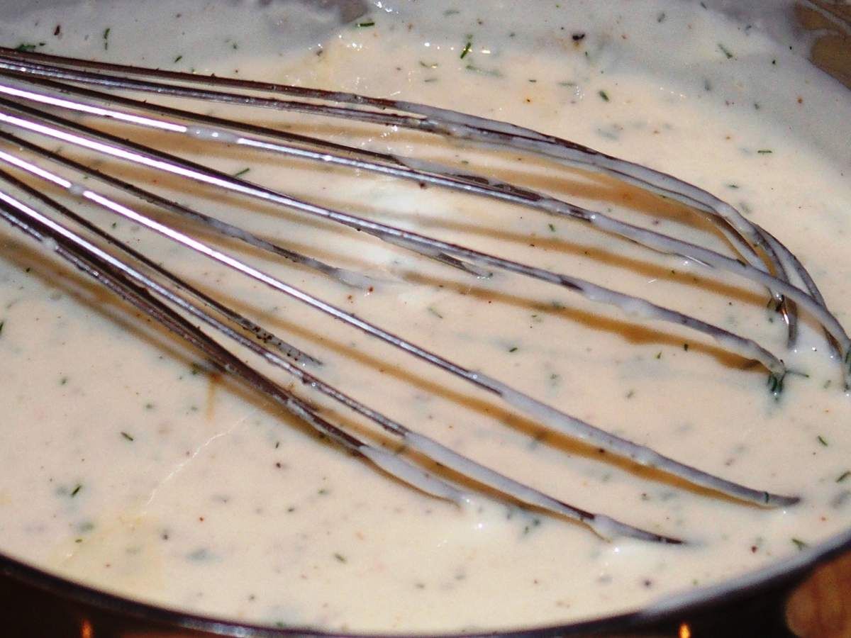 2) Préparer la béchamel: Faire fondre 50g de beurre dans une casserole à feu moyen, ajouter 50g de farine et mélanger avec une spatule. Retirer la casserole du feu et verser en une fois le lait et la crème. Fouetter vigoureusement jusqu'à disparition des grumeaux. Remettre sur feu moyen. Assaisonner de noix de muscade râpée, sel et poivre. Ajouter le bouillon réservé. Laisser cuire ainsi sur feu doux après l'ébullition en fouettant régulièrement durant environ 10 minutes jusqu'à ce que la sauce épaississe. Goûter et rectifier l'assaisonnement. Ajouter l'aneth ciselé. Couper le feu et laisser tiédir.