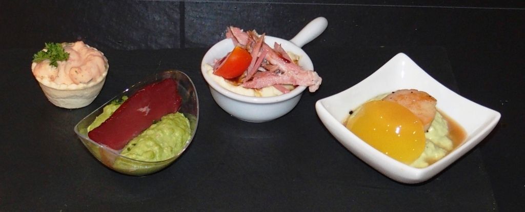 Je vous propose aujourd'hui de délicieux petits amuse-bouches pour vos fêtes de fin d'année. Pour vous donner des idées. Des tartelettes de cocktail de crevettes, des noix de St-Jacques sur une purée d'avocat et sa gelée d'agrumes, des magrets de canard fumés sur purée de petits pois et une purée de panais et jambon. Simples à préparer, ils feront tout leur petit effet. Et puis c'est mieux que des chips ou des cacahuètes non?