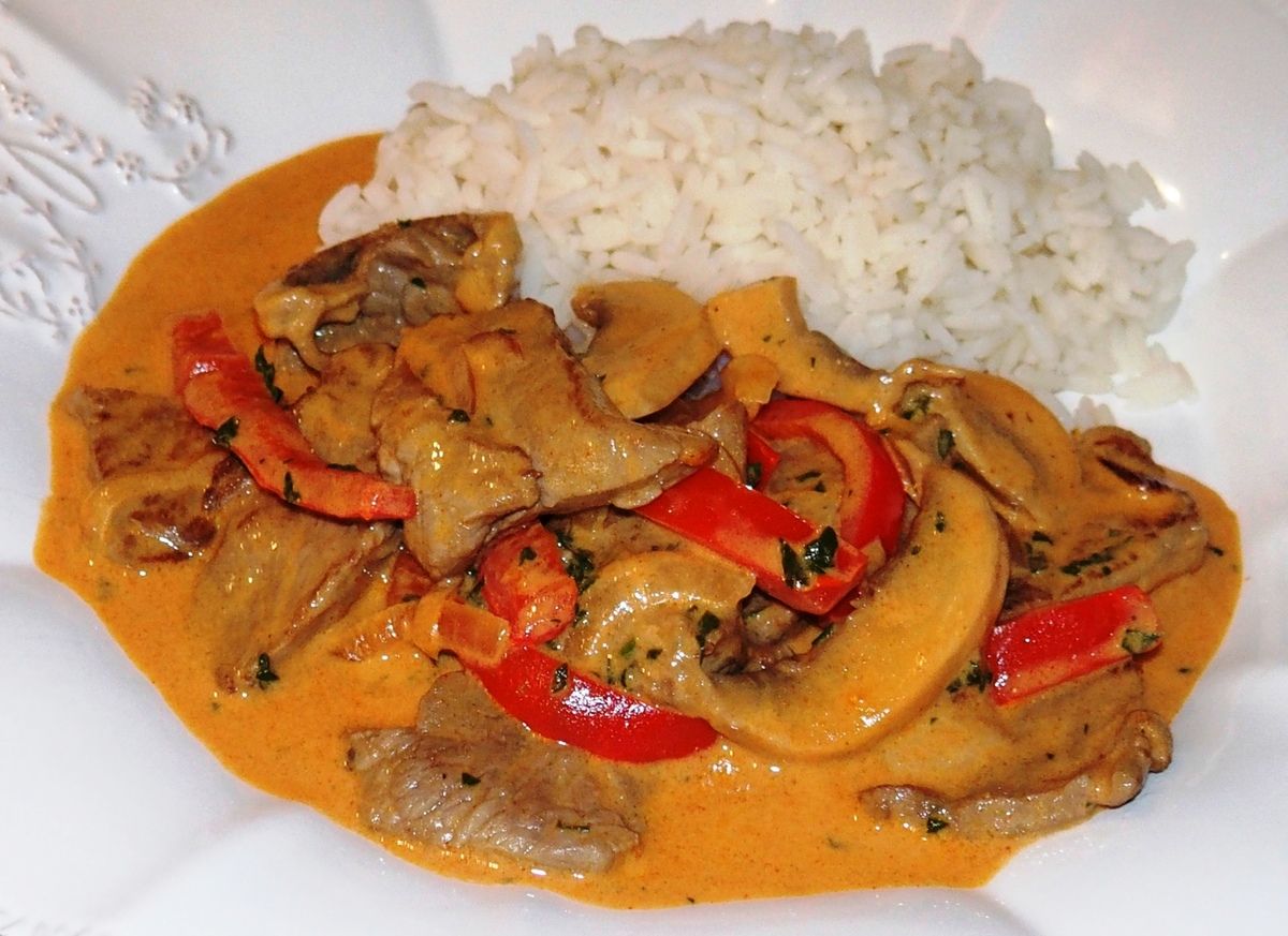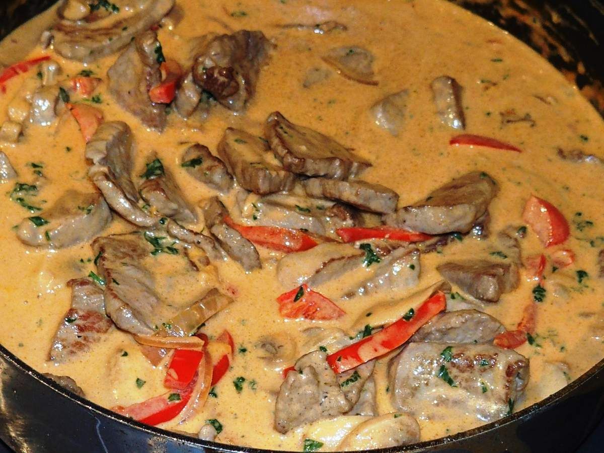 5) Ajouter la crème et le persil. Cuire encore jusqu'à l'ébullition puis goûter et rectifier l'assaisonnement en sel ou paprika si vous aimez ce qui est épicé. Ajouter la viande pour la réchauffer 2 minutes sur feu très doux, pas plus!