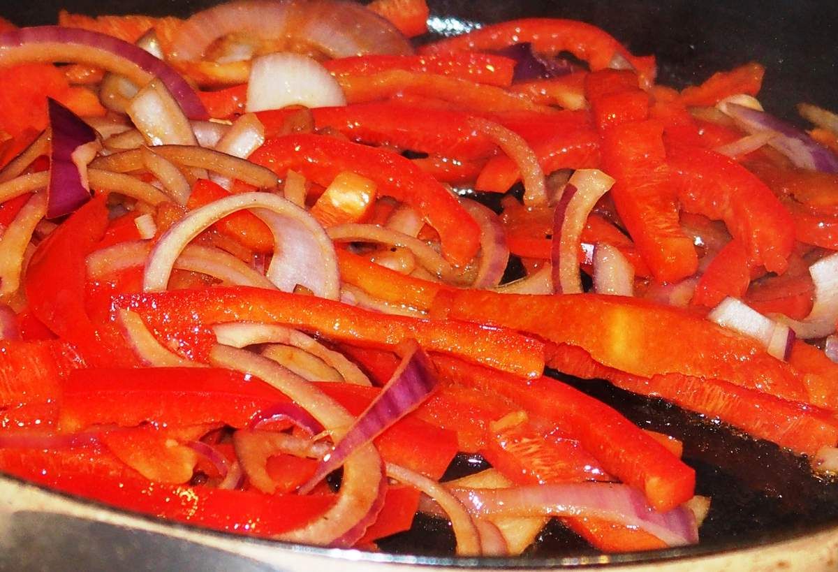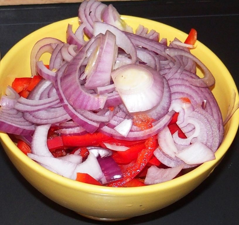 2) Peler et émincer l'oignon rouge en lamelles. Couper également le poivron en fines lamelles et mettre avec l'oignon dans un bol. Essuyer les champignons de Paris avec du papier ménage, couper la base des pieds et couper en lamelles pas trop fines. Réserver dans un bol.