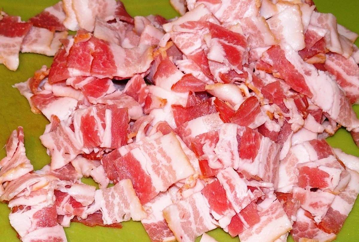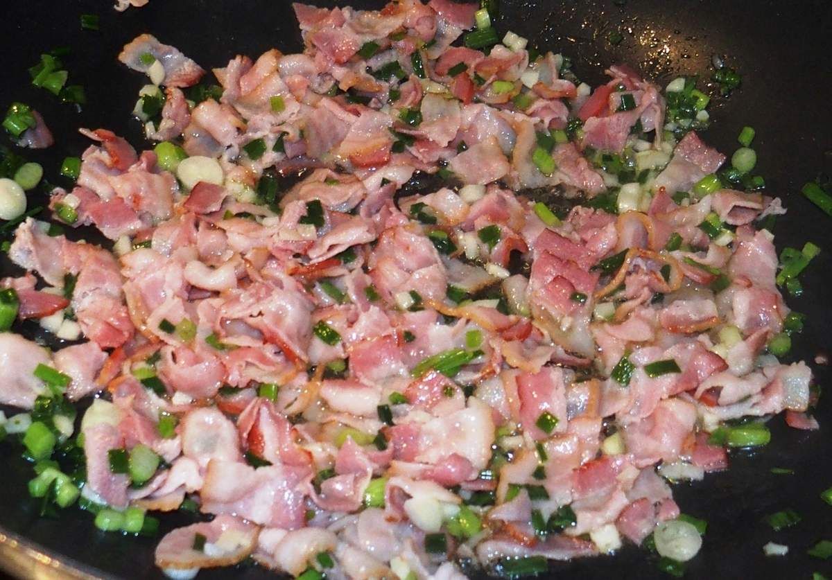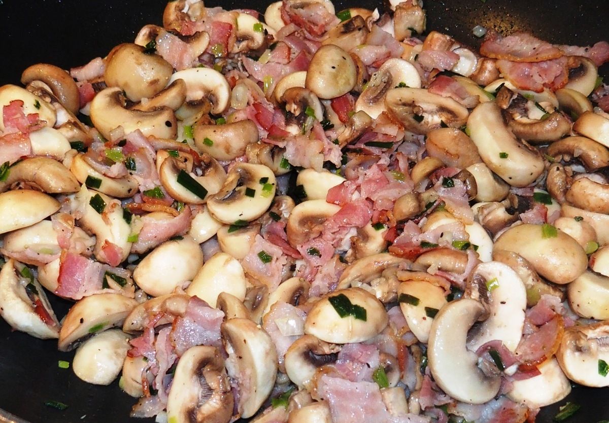 4) Dans une poêle, mettre à chauffer un filet d'huile d'olive et faire revenir sur feu moyen les oignons et l'ail une minute. Ajouter le bacon, cuire 3 minutes puis ajouter les champignons et faire revenir encore 5 minutes, toujours sur feu moyen. Bien mélanger, jusqu'à qu'il n'y ait plus de liquide. Poivrer. Ajouter le vin blanc et laisser réduire de moitié environ 5 minutes.