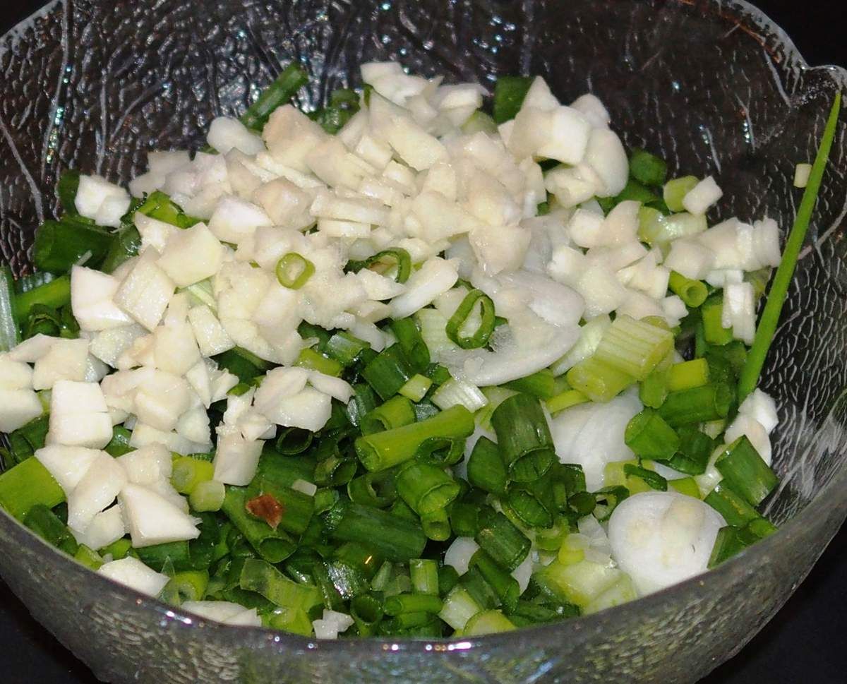 1) Passer les oignons de printemps sous l'eau froide et les émincer en fines rondelles (avec les 3/4 des tiges). Hacher les gousses d'ail et réserver le tout dans un bol.