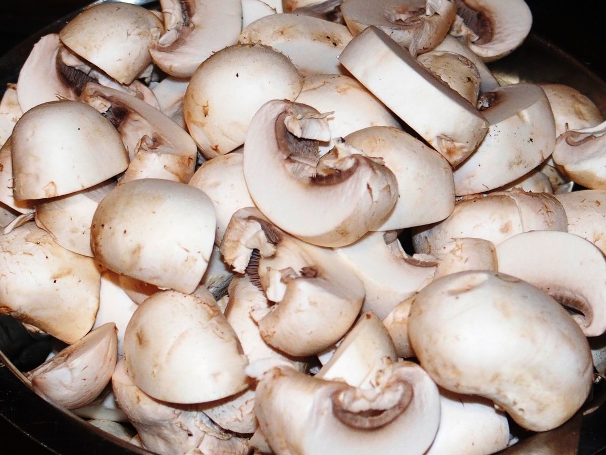 3) Essuyer les champignons de Paris avec un papier ménage. Retirer les pieds, Couper les champignons en lamelles moyennes et réserver.