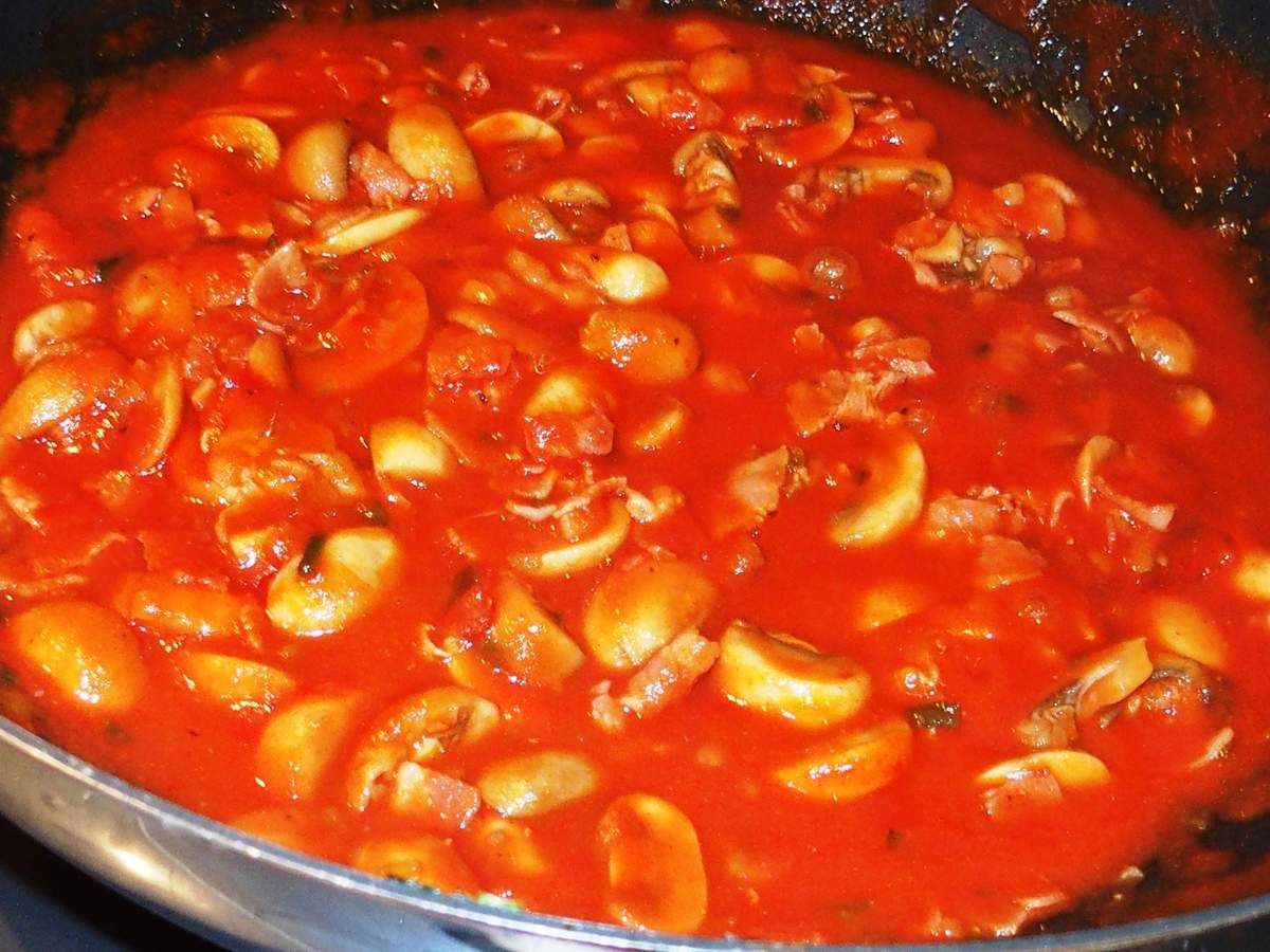 Une sauce à la boscaiola, avec du bacon, des champignons, de la tomate, de la crème et du persil. Super bon, et si facile!