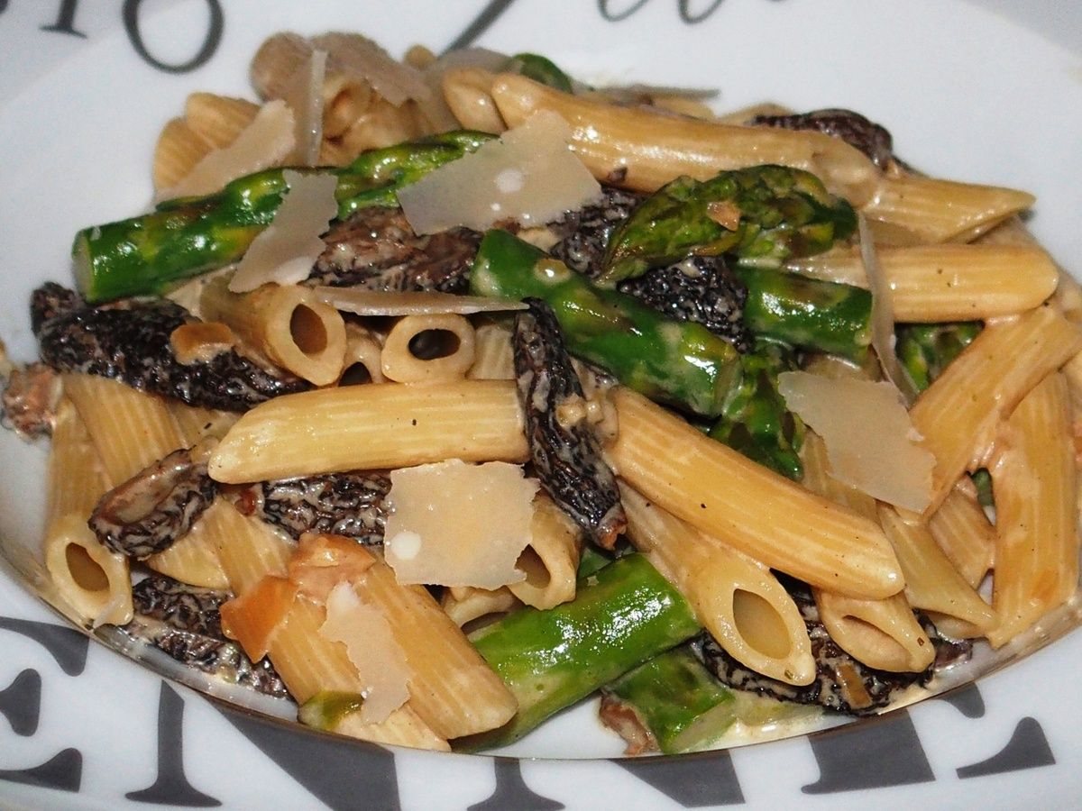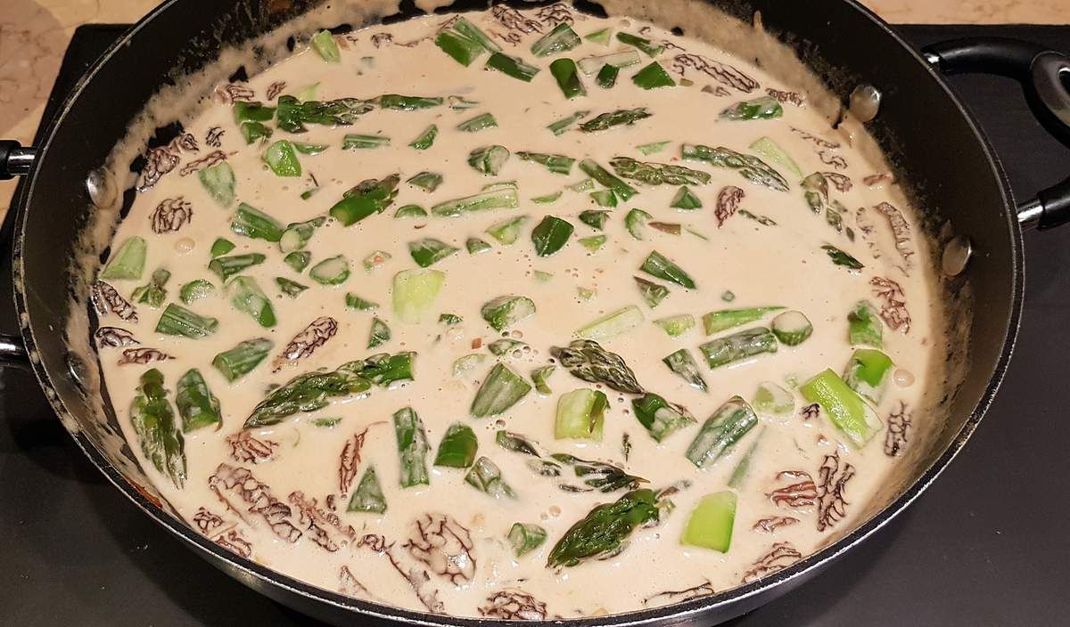 5) Ajouter le jus de trempage des morilles (2dl) ainsi que le cube de bouillon de légumes. Laisser réduire sur feu moyen ainsi 10 à 15 minutes. Ajouter la crème et laisser réduire encore 5 minutes sur feu moyen. Ajouter les asperges, compter encore 2 minutes de cuisson. Goûter et rectifier l'assaisonnement.