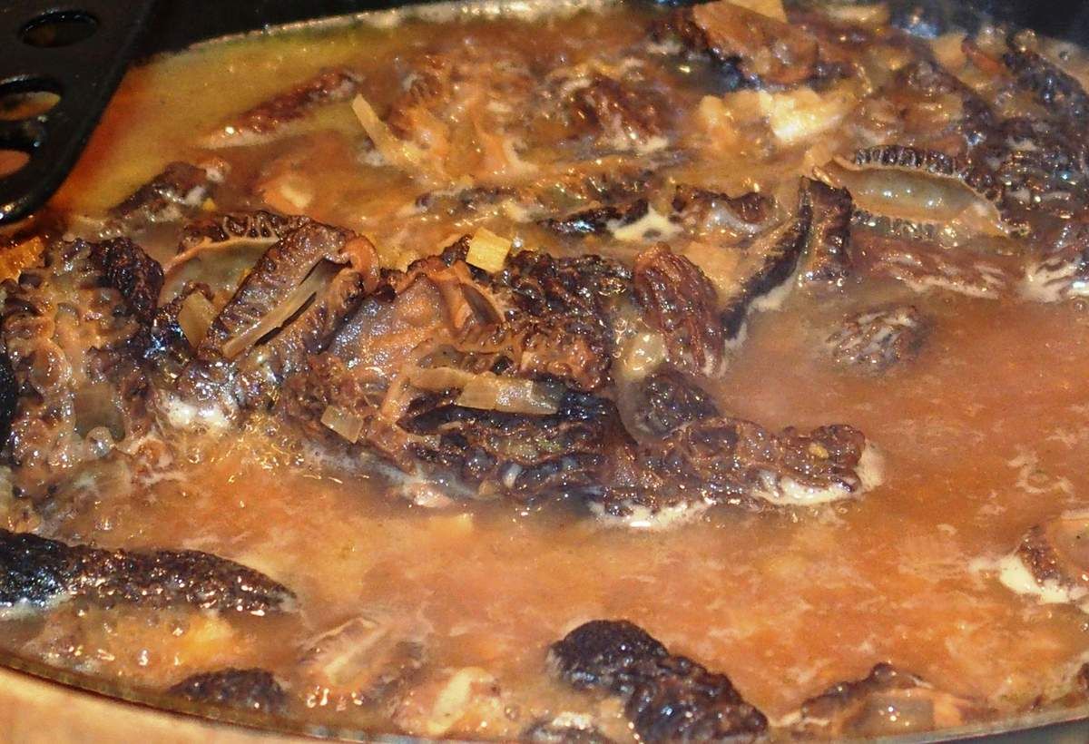1) Remplir un bol d'eau froide (environ 5 dl) et faire tremper les morilles plusieurs heures ou au mieux, la veille. Conserver environ 2dl de l'eau trempage et la filtrer dans un récipient à travers une passoire fine. Conserver. Couper les plus grosses morilles en deux dans la longueur et les passer sous l'eau froide pour bien les nettoyer. Egoutter. Réserver.