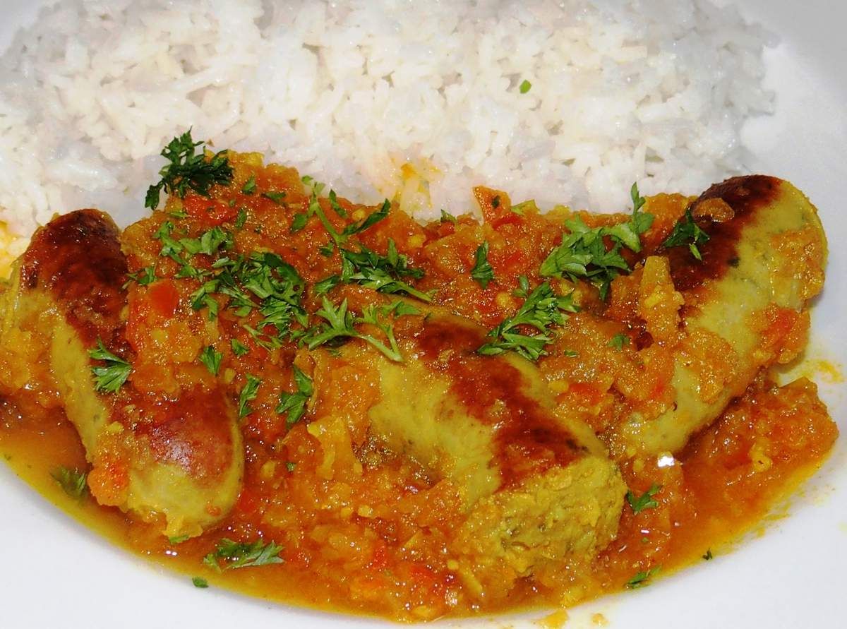 4) Plonger les saucisses dans la casserole du cari et laisser mijoter encore environ 15 minutes sur feu doux. Goûter et rectifier l'assaisonnement en sel si nécessaire. Servir avec du riz parfumé et un peu de coriandre ciselée (ou du persil).