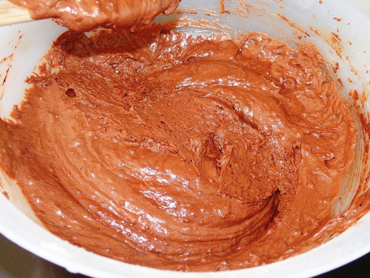 3) Dans un autre récipient, mettre la farine, la poudre d'amandes, la poudre à lever, le sel et le cacao et mélanger avec une cuillère. Ajouter dans l'autre récipient et toujours bien mélanger jusqu'à ce que la pâte soit lisse.