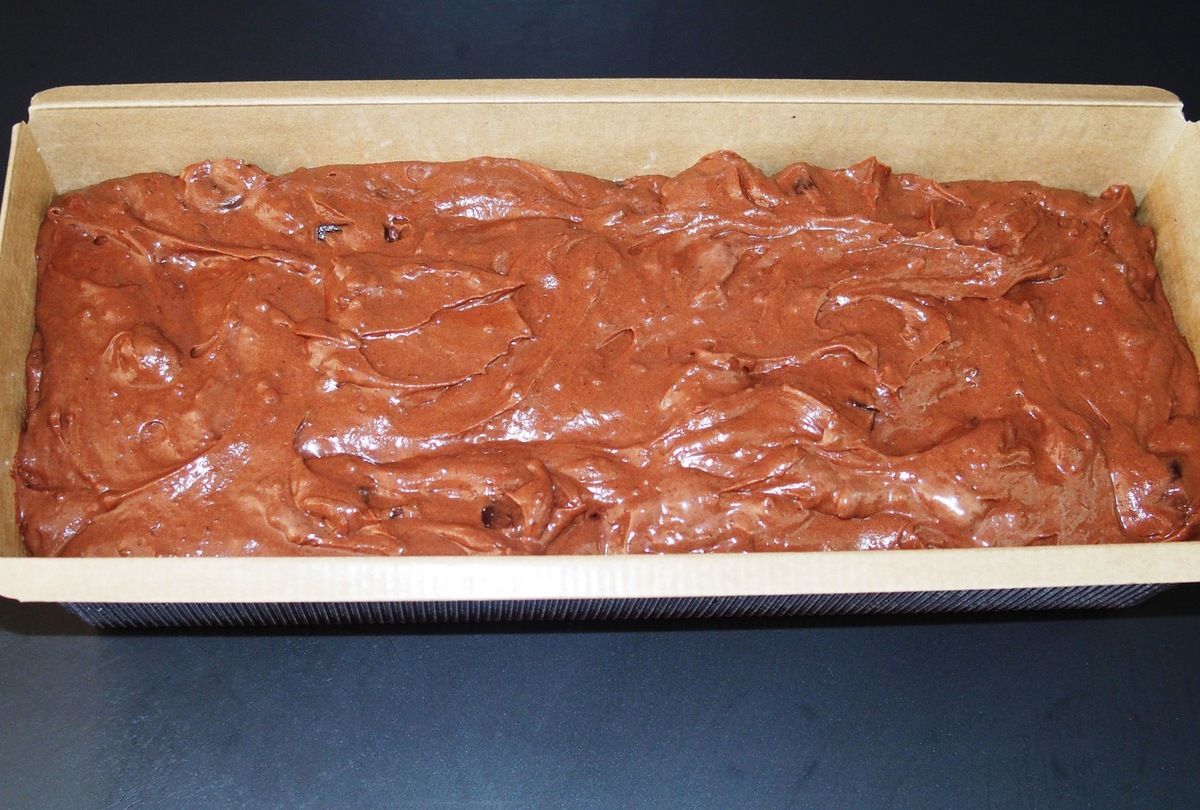 5) Dans le moule, verser la moitié de la préparation. Parsemer de la moitié des dés de chocolat et avec une spatule, les enfoncer légèrement dans l'appareil. Verser la deuxième moitié de la préparation et ajouter la deuxième moitié des dés de chocolat. A nouveau, les enfoncer légèrement dans l'appareil avec la spatule. Lisser un peu.