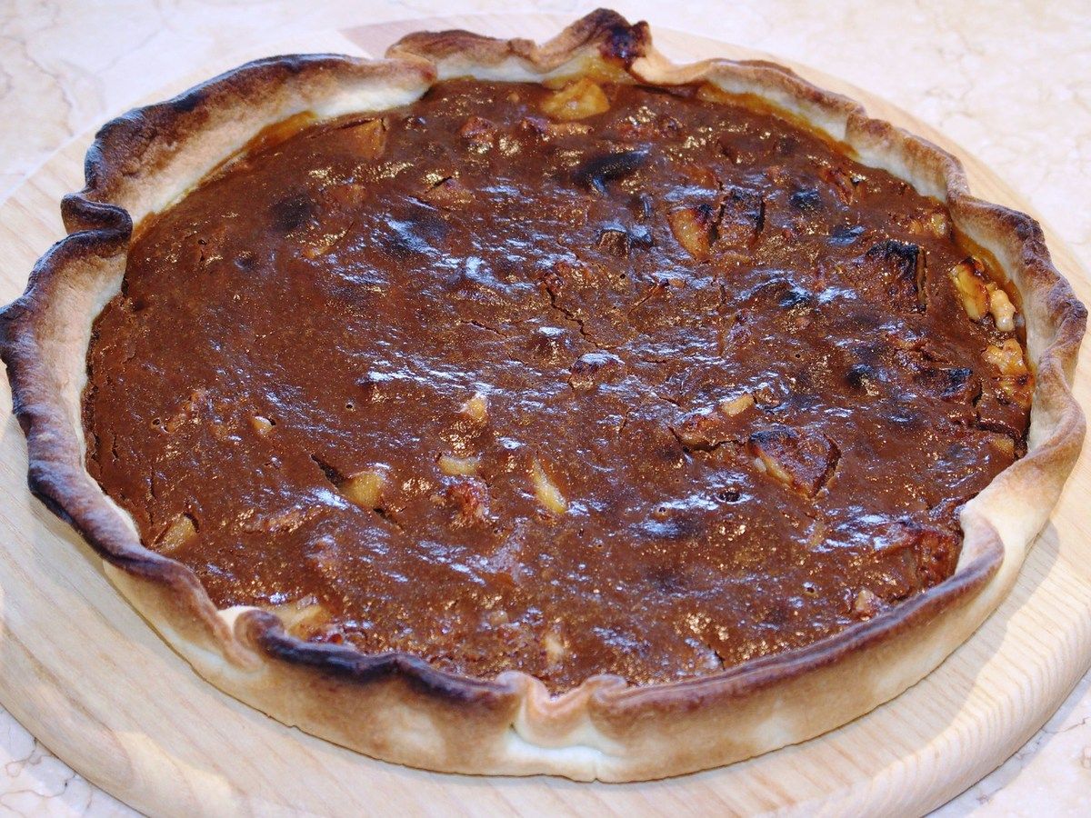 4) Beurrer et fariner la plaque à gâteau ou mettre la pâte avec le papier sulfurisé dans la plaque. Bien faire remonter les bords en appuyant sur tout le tour de la plaque. Piquer le fond avec une fourchette. Saupoudrer le fond d'une bonne càs de farine. Mettre les pommes et les cerneaux de noix. Aouter la liaison au nillon délicatement.