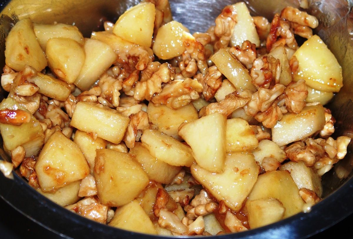 2) Pendant ce temps, peler les pommes et retirer le centre. Les couper en petits dés. Concasser grossièrement les cerneaux de noix. Dans une poêle, faire fondre le beurre. Ajouter les pommes et les cerneaux de noix. Saupoudrer de 3 càs de sucre et caraméliser sur feu moyen une dizaine de minutes en mélangeant souvent. Laisser tiédir. Préchauffer le four à 220°C.