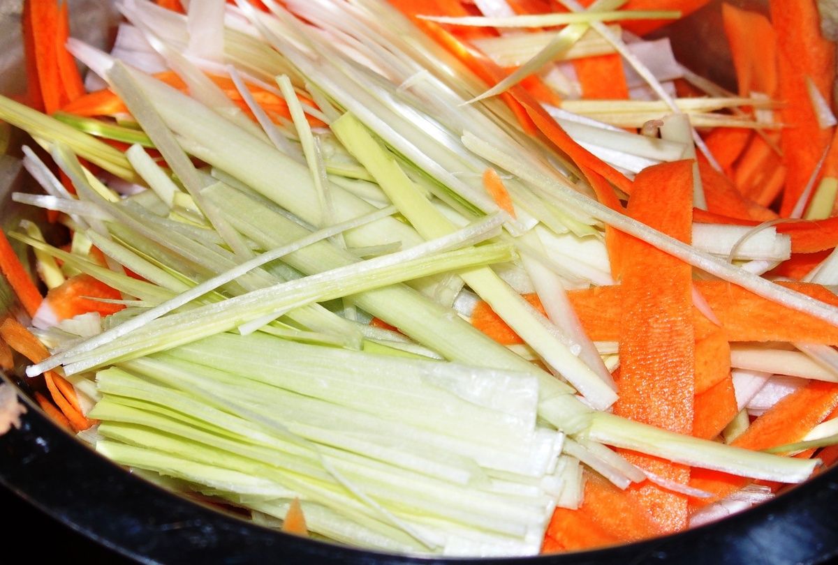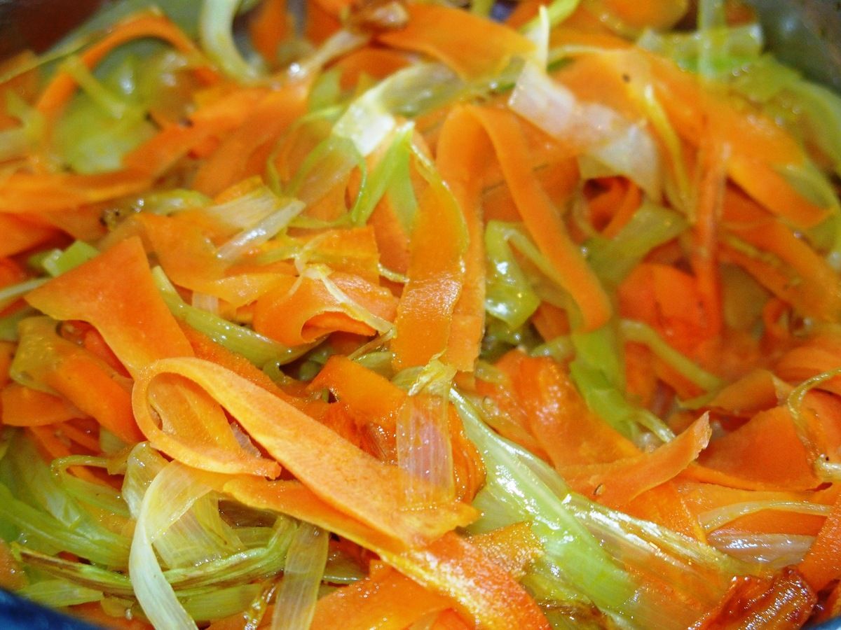 1) Peler les carottes et les couper en julienne avec un économe. Laver le blanc de poireau, le couper en deux la longueur, puis en deux dans la largeur et couper de très fines lamelles. Réserver ces deux légumes dans un récipient.