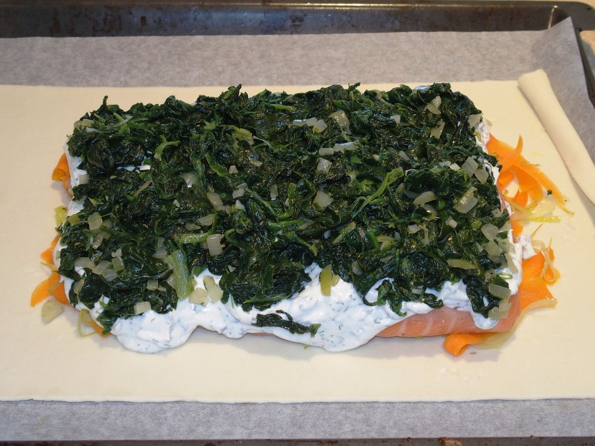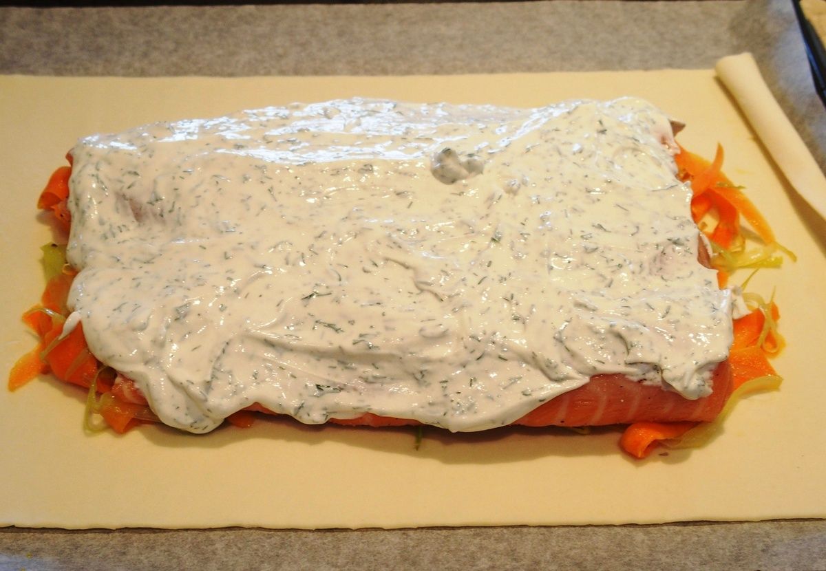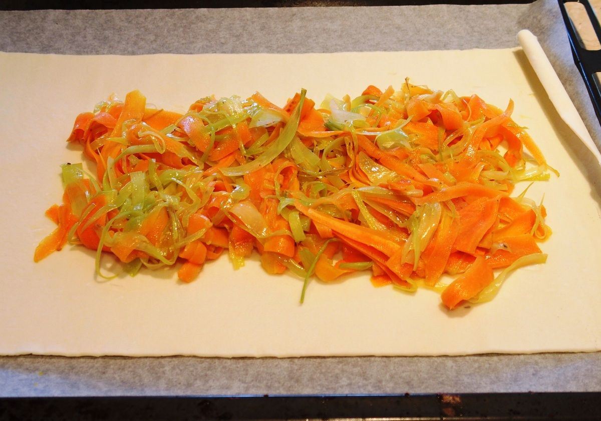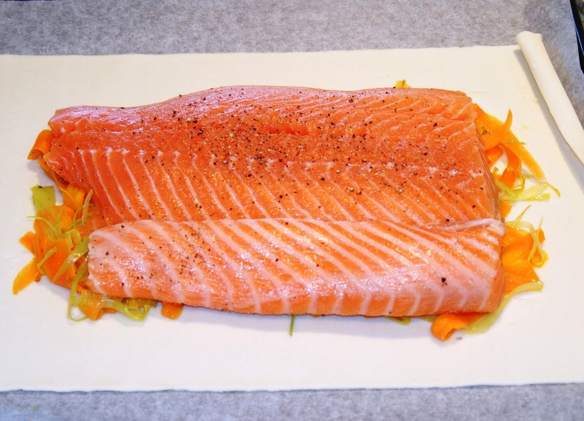 5) Prendre la première abaisse de pâte et la disposer sur une grande planche recouverte de papier sulfurisé. Je l'avais fait directement dans la plaque, mais comme une nouille, je n'avais pas pensé qu'elle ne rentrerait pas dans mon réfrigérateur. Donc j'ai dû transférer le feuilleté sur une planche, puis à nouveau sur la plaque. Bref. Couper une bande d'environ 3cm sur la longueur. Car cette abaisse-là doit être plus petite que la deuxième. Vous utiliserez cette bande de pâte pour faire des décos :-). Disposer la julienne de légumes sur une surface correspondant à la taille du pavé de saumon. Puis assaisonnez de sel et poivre le saumon des deux côtés et le poser dessus.