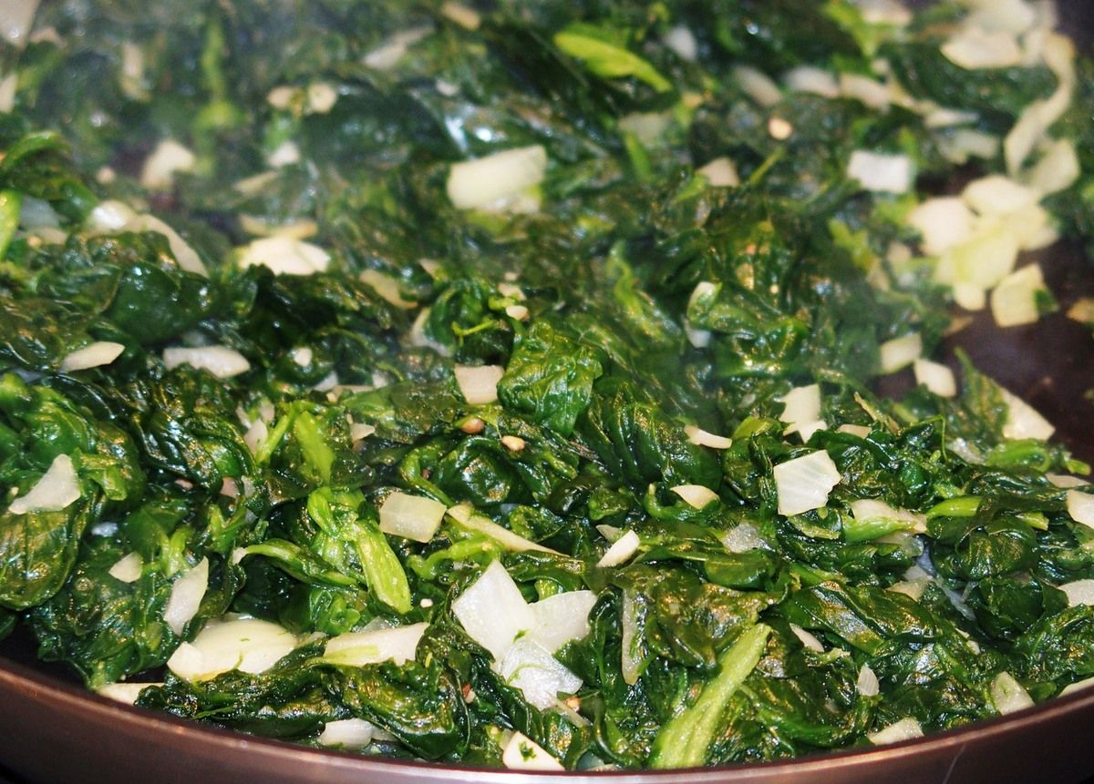 2) Hacher l'oignon et les gousses d'ail. Dans une poêle, faire chauffer un filet d'huile d'olive et faire revenir oignon et ail 1 minute à feu moyen puis ajouter les épinards. Poivrer et saler. Faire cuire ainsi en mélangeant souvent jusqu'à ce que les épinards aient rendus toute leur eau (quand ils commencent à attacher le fond, c'est que c'est bon). Les laisser tiédir dans une passoire.