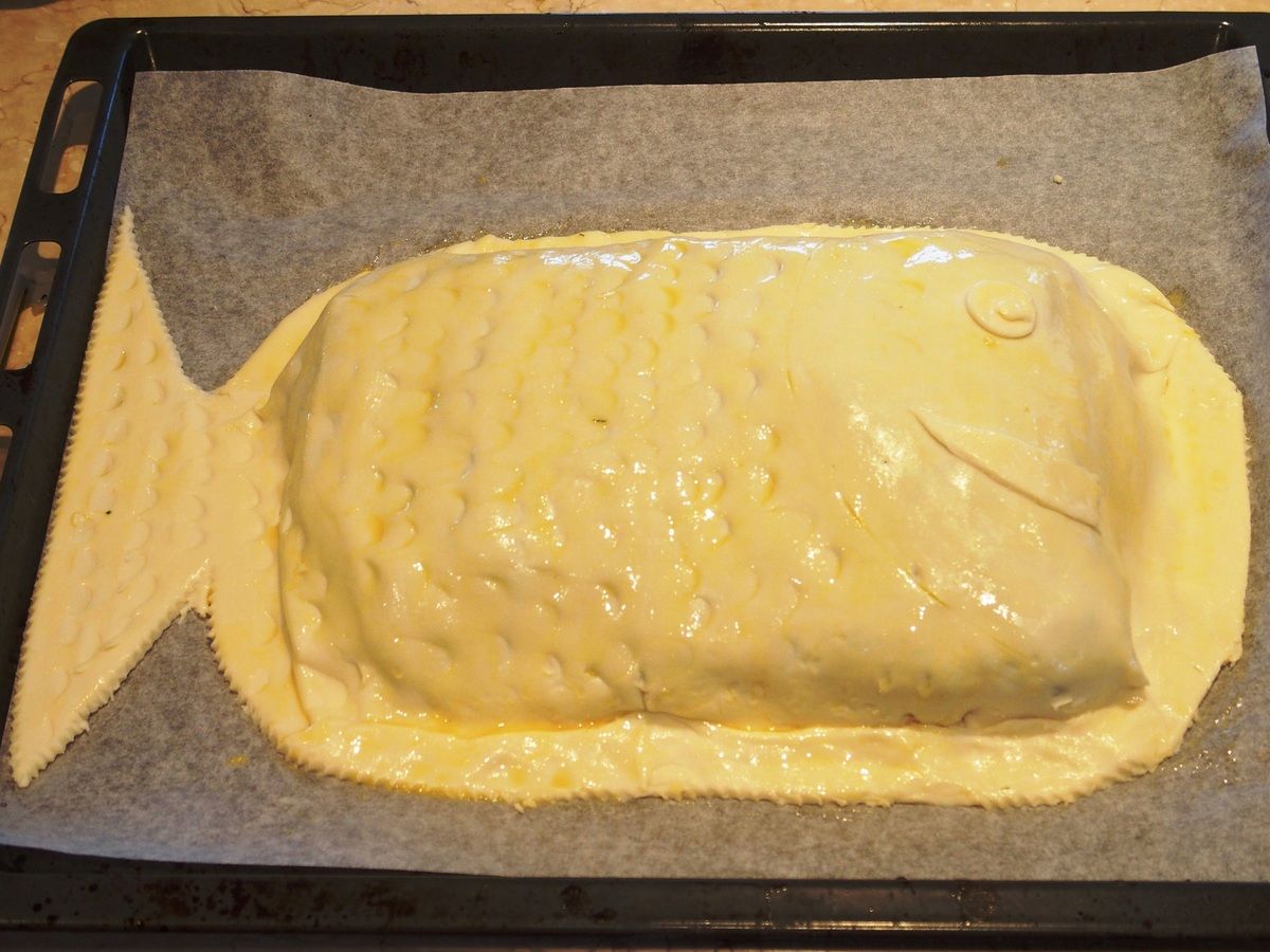7) Recouvrir le tout avec la deuxième abaisse de pâte. Appuyer bien pour souder les deux pâtes. Puis découper une forme de poisson. Ou de sanglier. Ou de gnome. Ou pas. Peu importe. Moi, j'ai utilisé une petite roulette à pâtisseries. Retirer les excédents de pâtes et découper dans ceux-ci des petites décorations (yeux, bouche, orteil...). Placer les décos. Pour les écailles, j'ai appuyé en ligne sur le feuilleté avec le bout d'un couteau rond. Mais la prochaine fois j'appuierai plus, on ne les voyait pas assez. Badigeonner avec un pinceau tout le feuilleté à l'oeuf. Mettre au réfrigérateur entre 30 et 60 minutes.