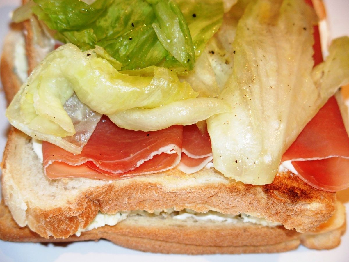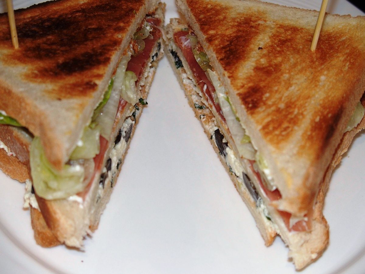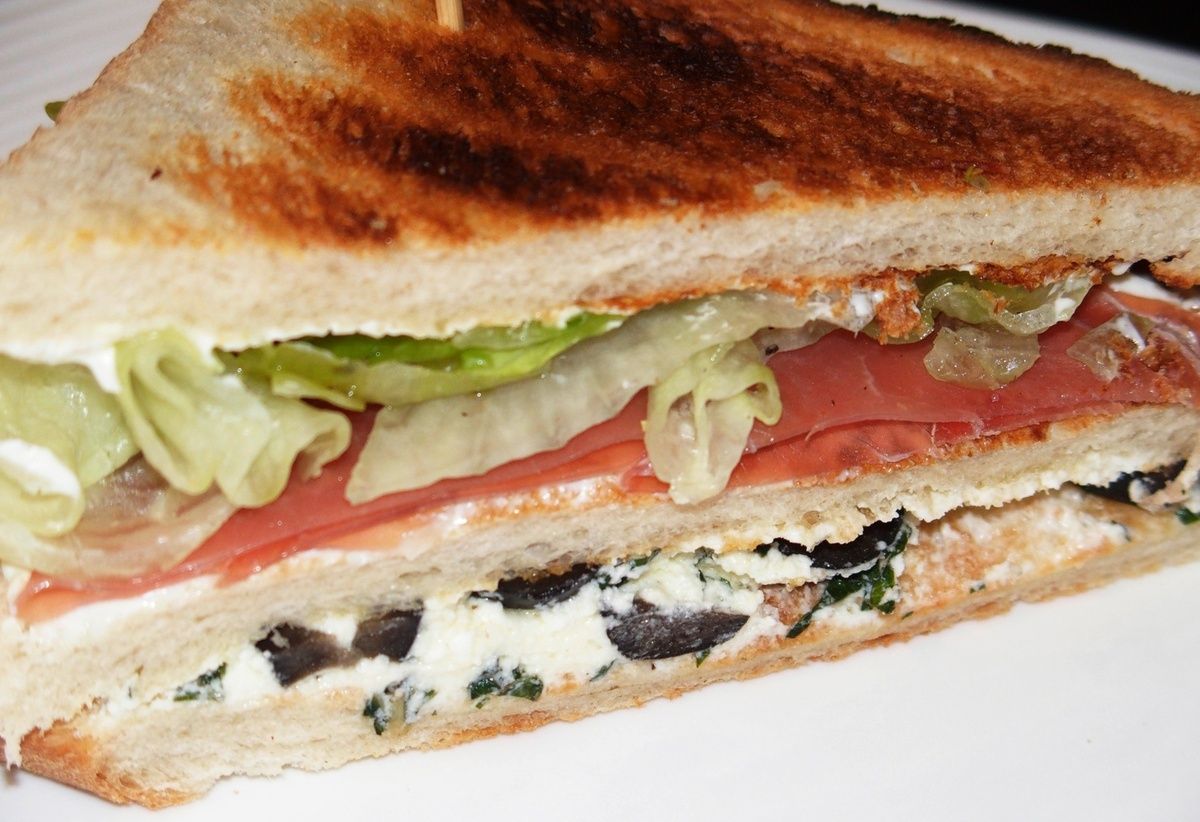 Club sandwich au fromage de chèvre, jambon cru et olives